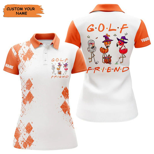 Customized Name Golf Women Polo Shirts,Orange Black Halloween Personalized Flamingo Golf Friends - Perfect Gift For Ladies, Golfers, Golf Lovers