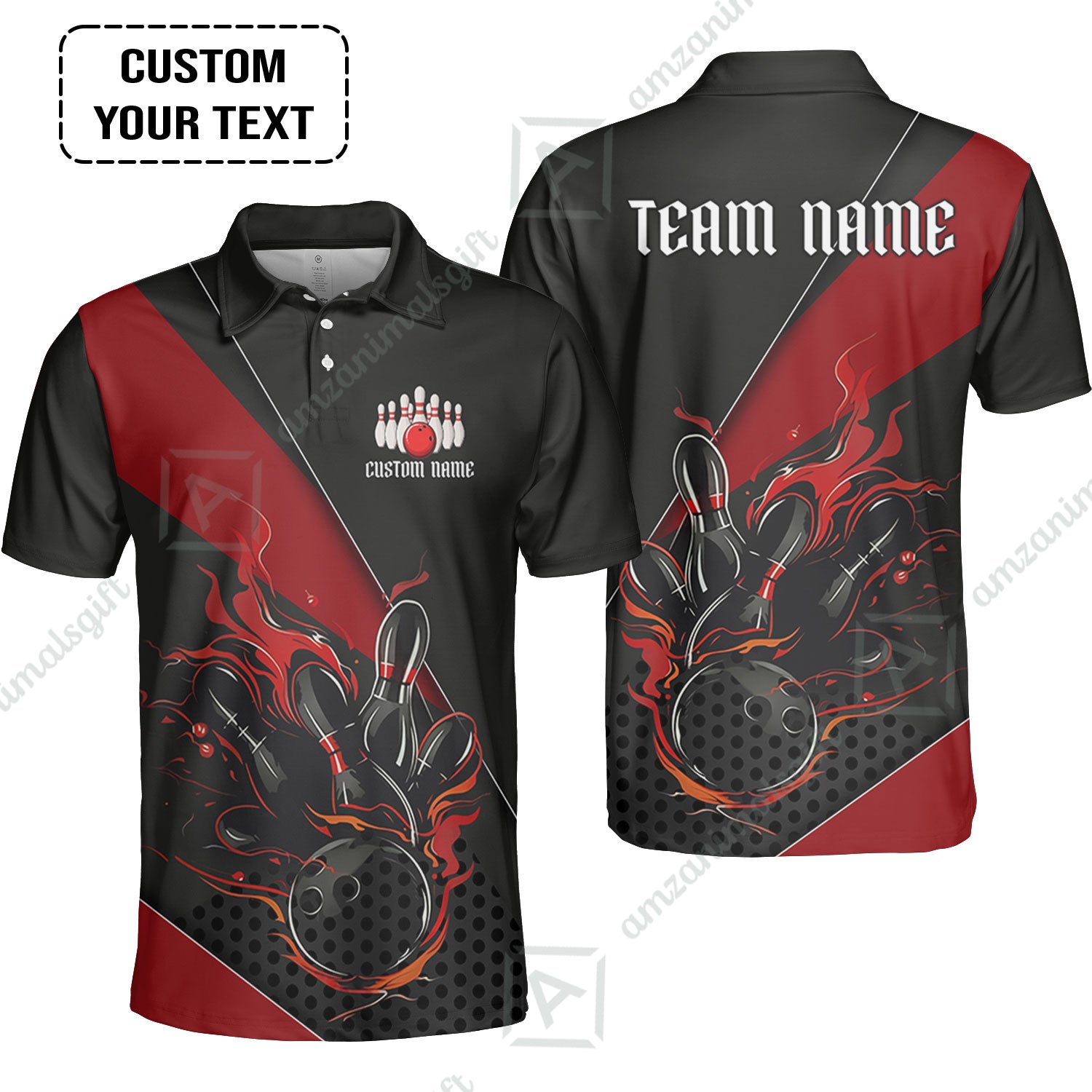 Customized Bowling Quarter-Zip Jersey Polo Shirts, Flaming Bowling Pins Esport Black Red Shirt For Tournament Team Men Women Bowlers