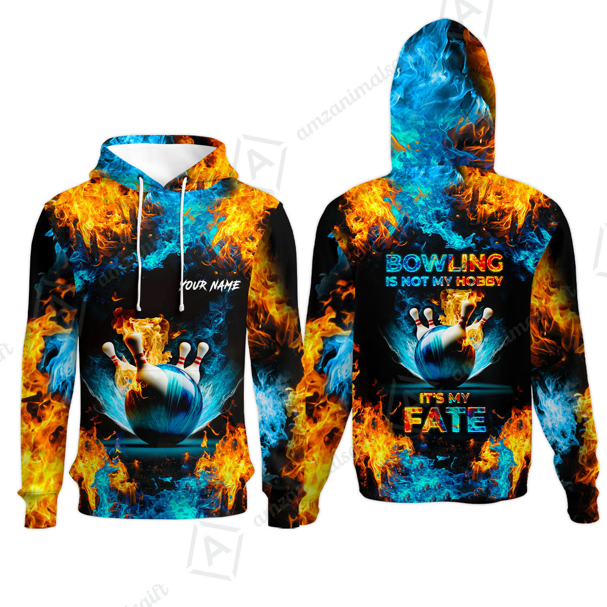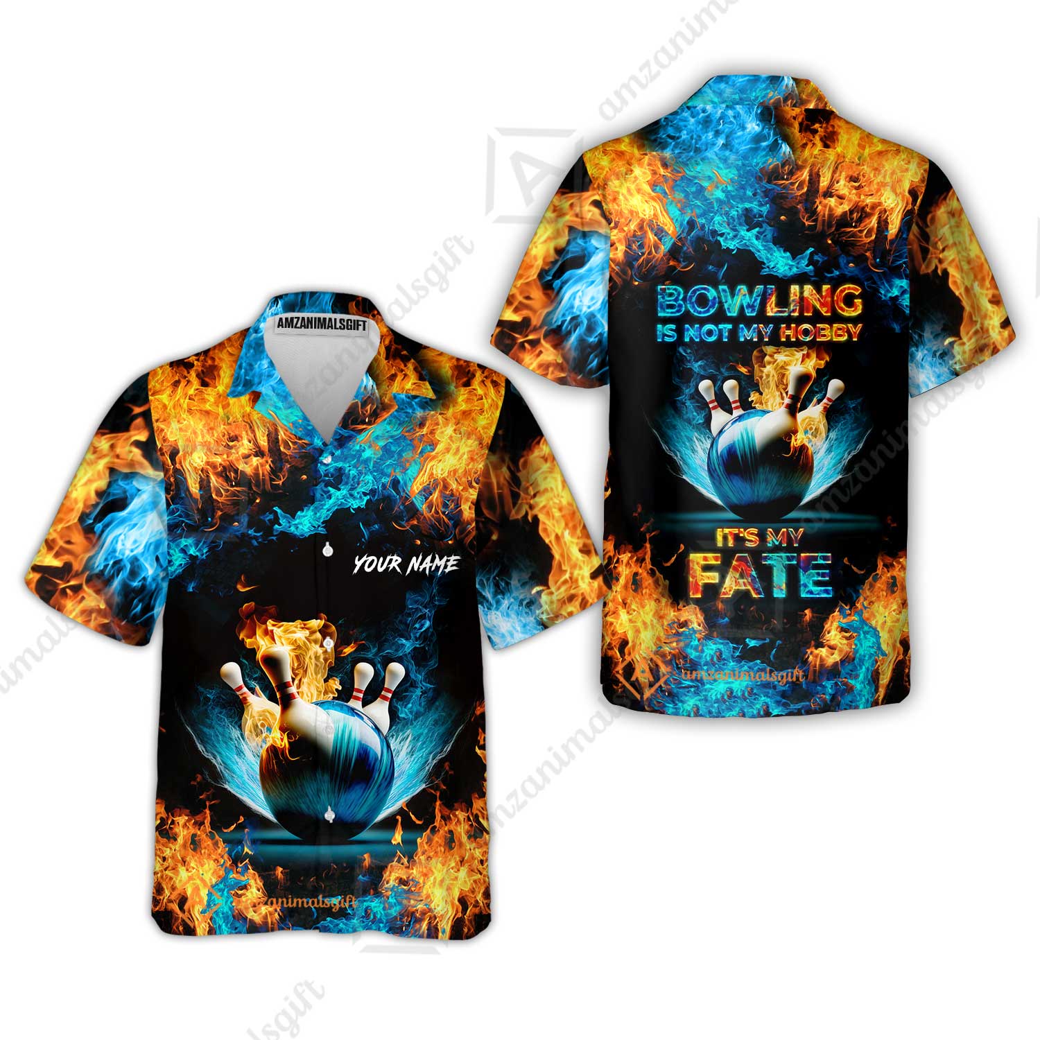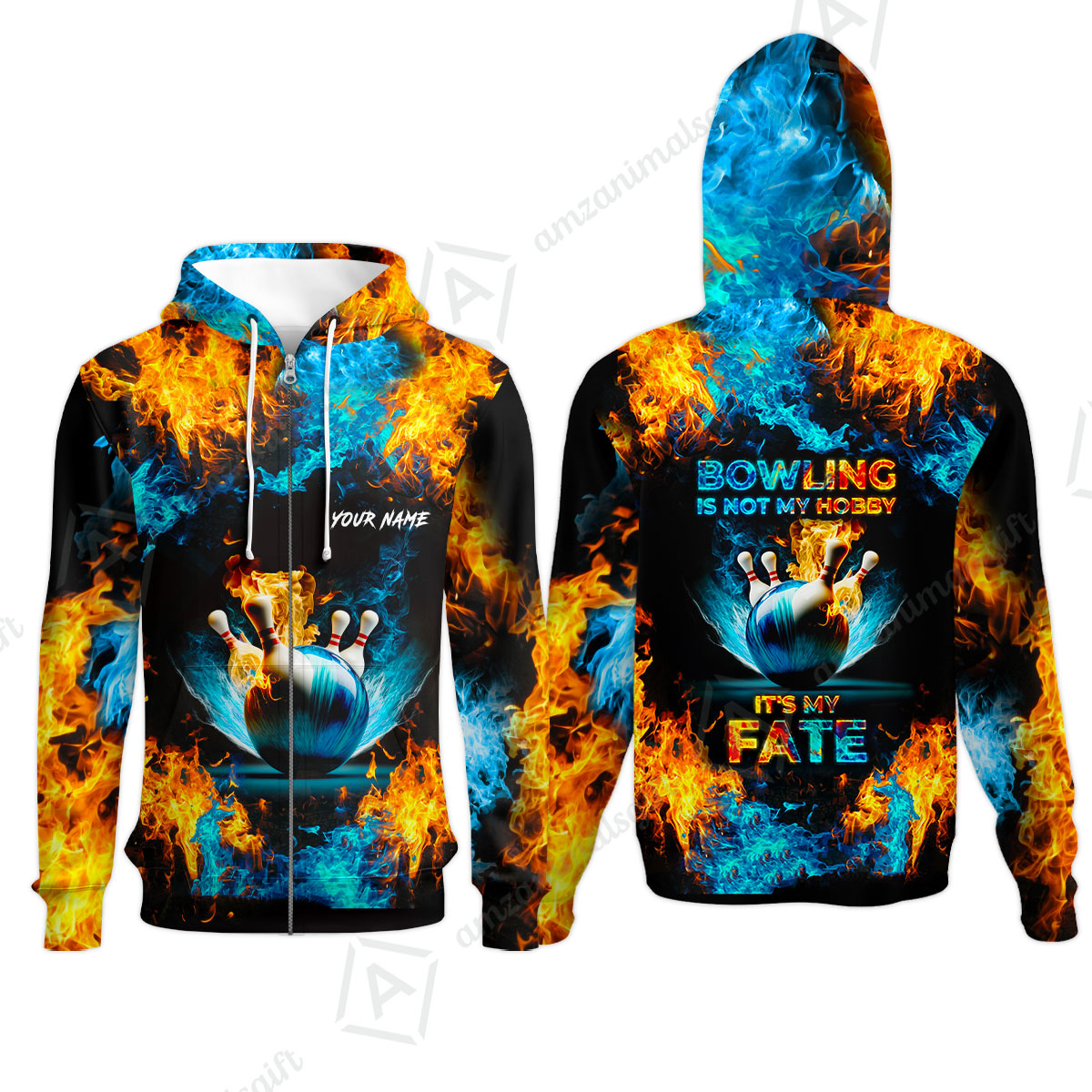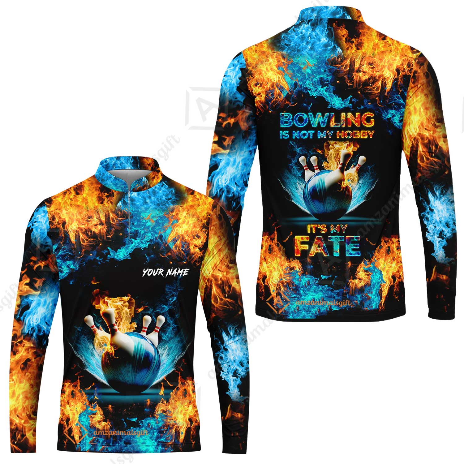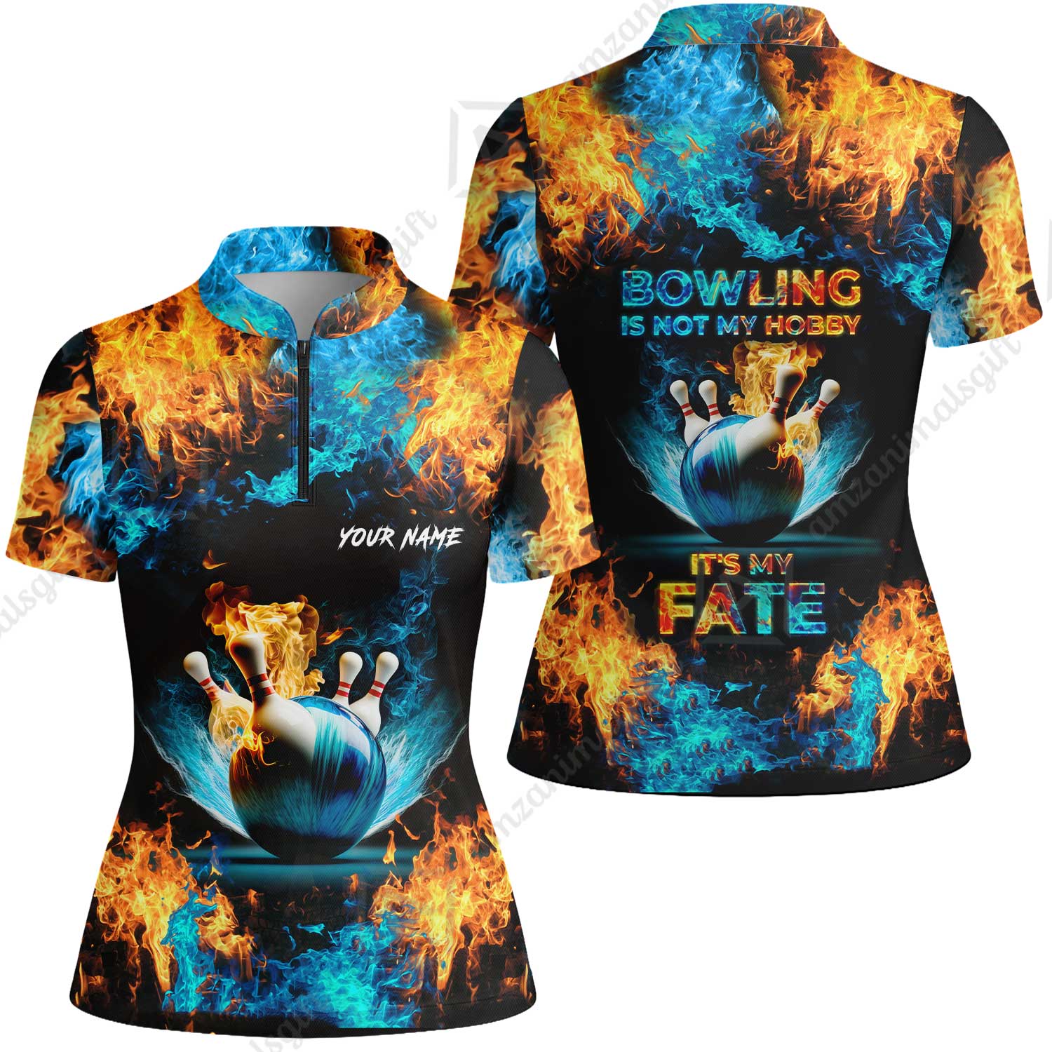 Bowling Custom Zip Polo Shirt - Custom Name Blue Bowling Ball And Pins On Fire Personalized Bowling Zip Polo Shirt