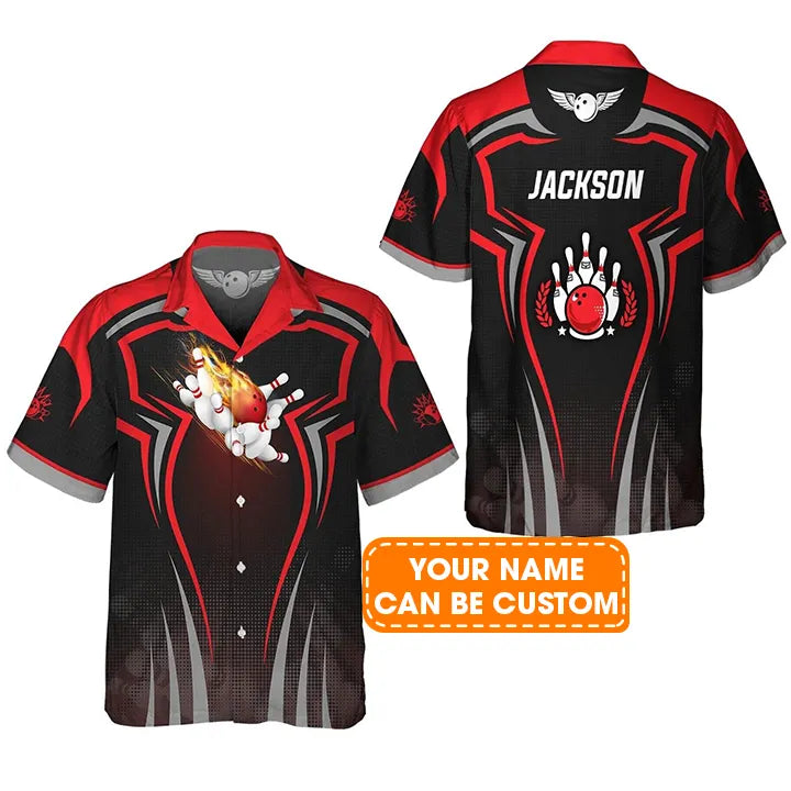 Bowling Hawaiian Shirt Custom Name - The Red Bowling Ball Crashing The Pins Personalized Aloha Hawaiian Shirt - Gift For Friend, Family, Bowling Lovers