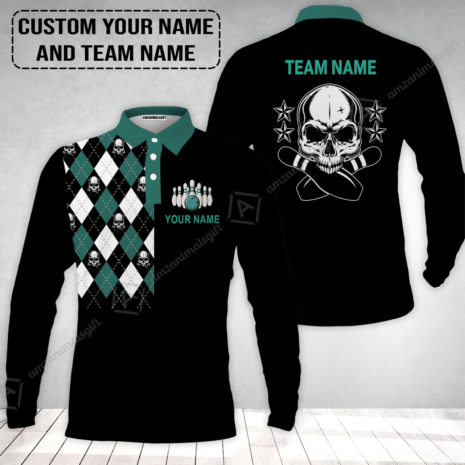 Custom Bowling Long Polo Shirt - Custom Name Skull Black Bowling Personalized Long Polo Shirt