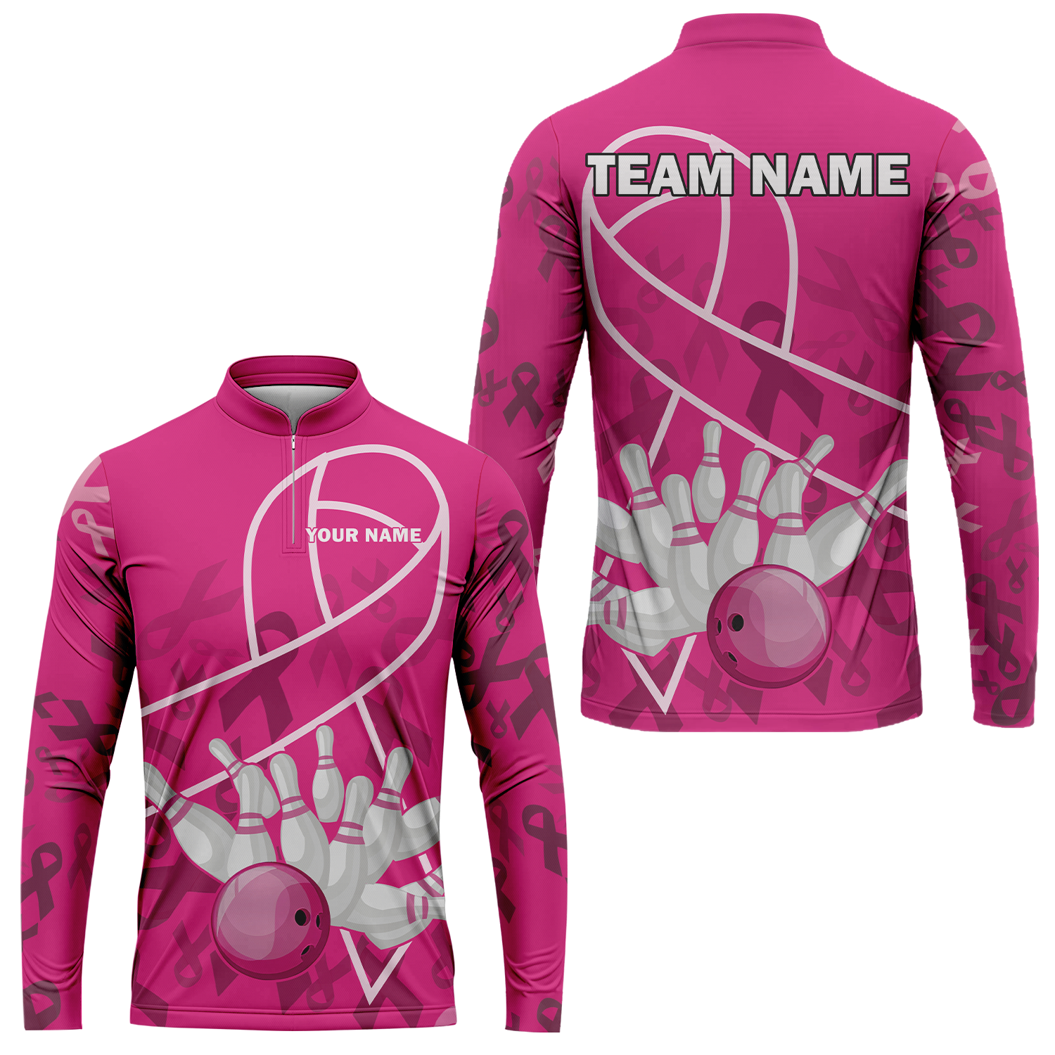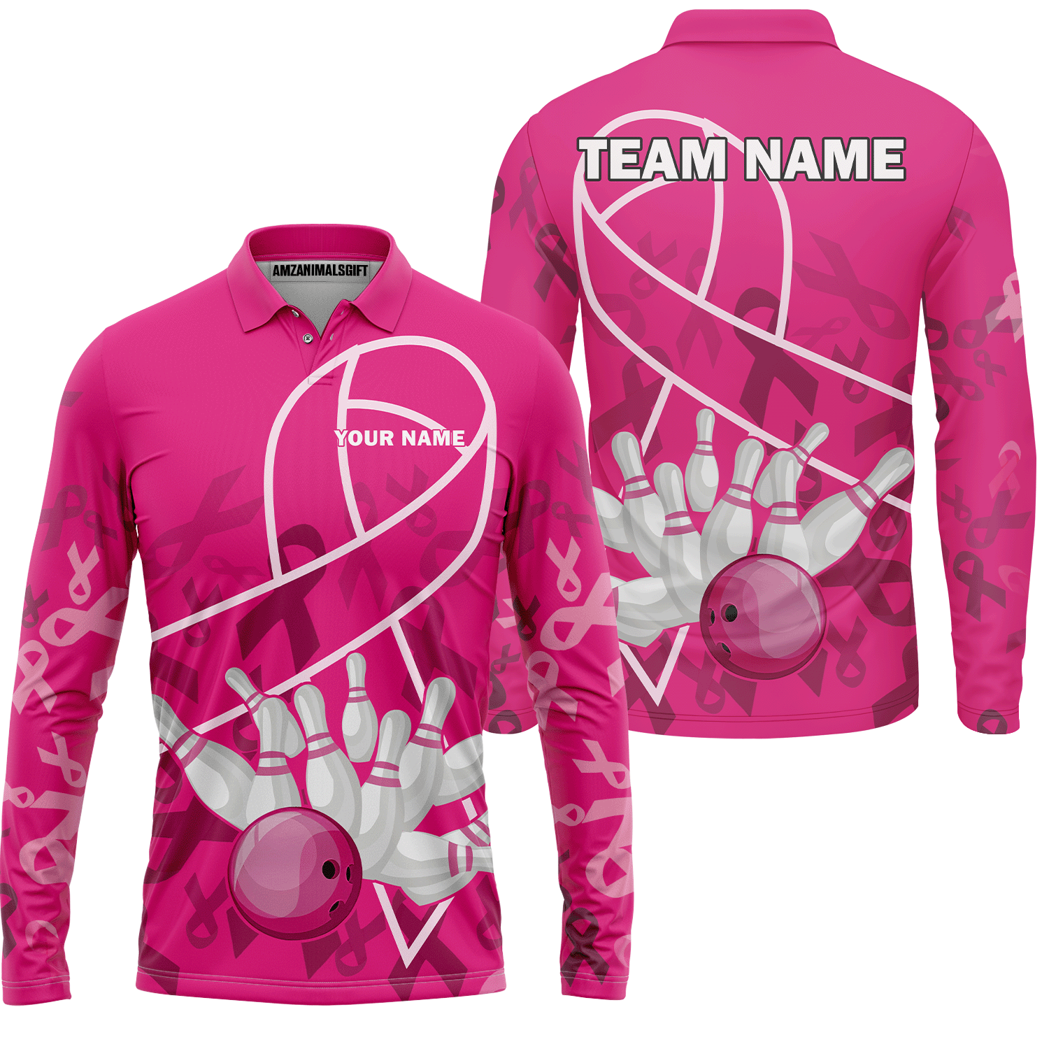 Custom Bowling Team Jerseys Polo Shirts for Breast Cancer Awareness, Bright Pink Bowling uniforms, pink bowling ball striking white pins Bowling Polo