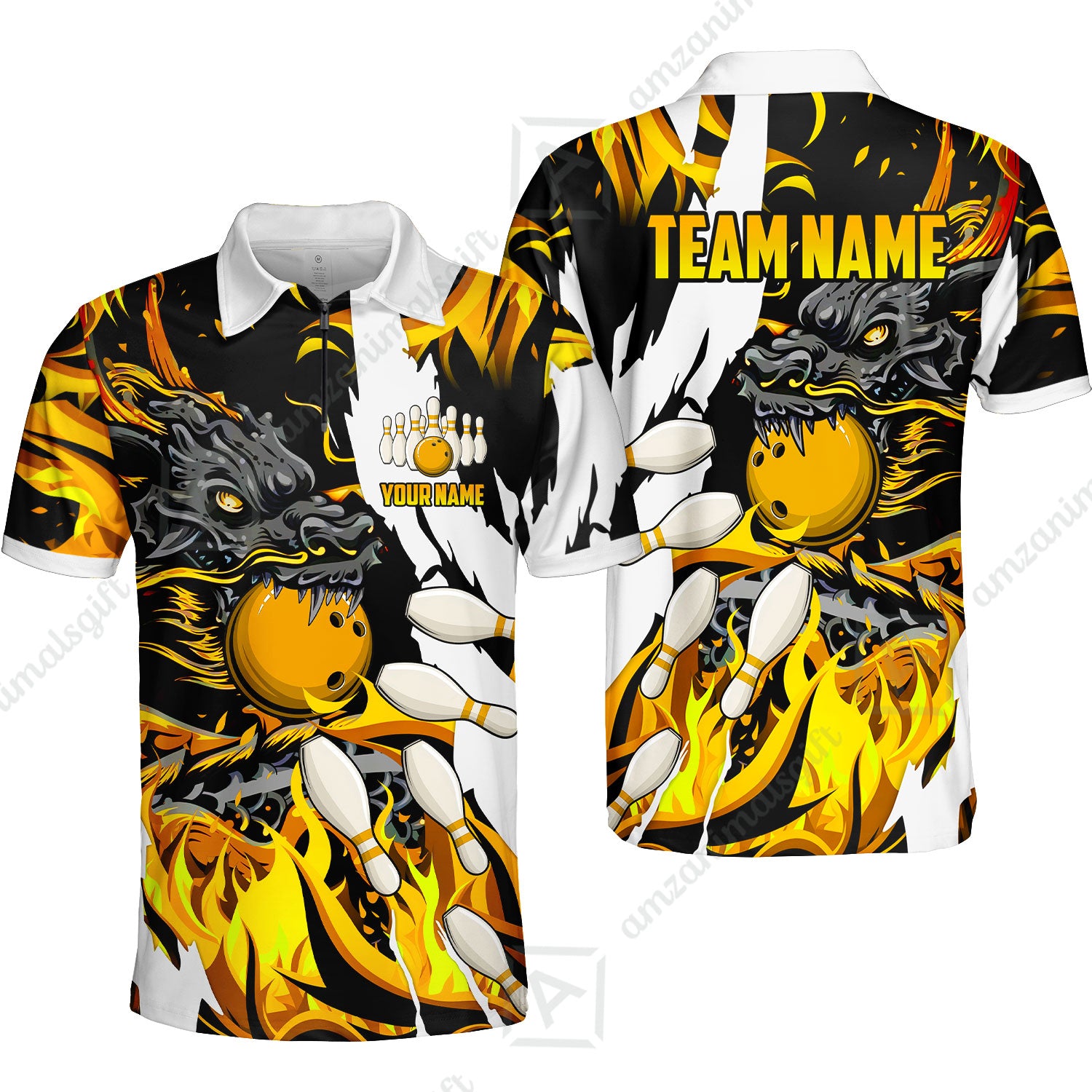 Custom Bowling Team Quater-Zip Polo Shirt, Bowling uniforms Ball & Pins Dragon Flame Pattern Personalized Name And Team Name