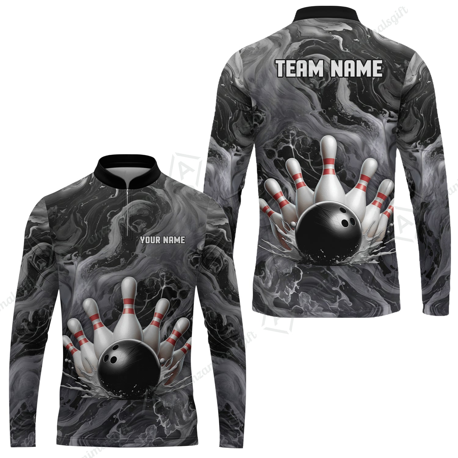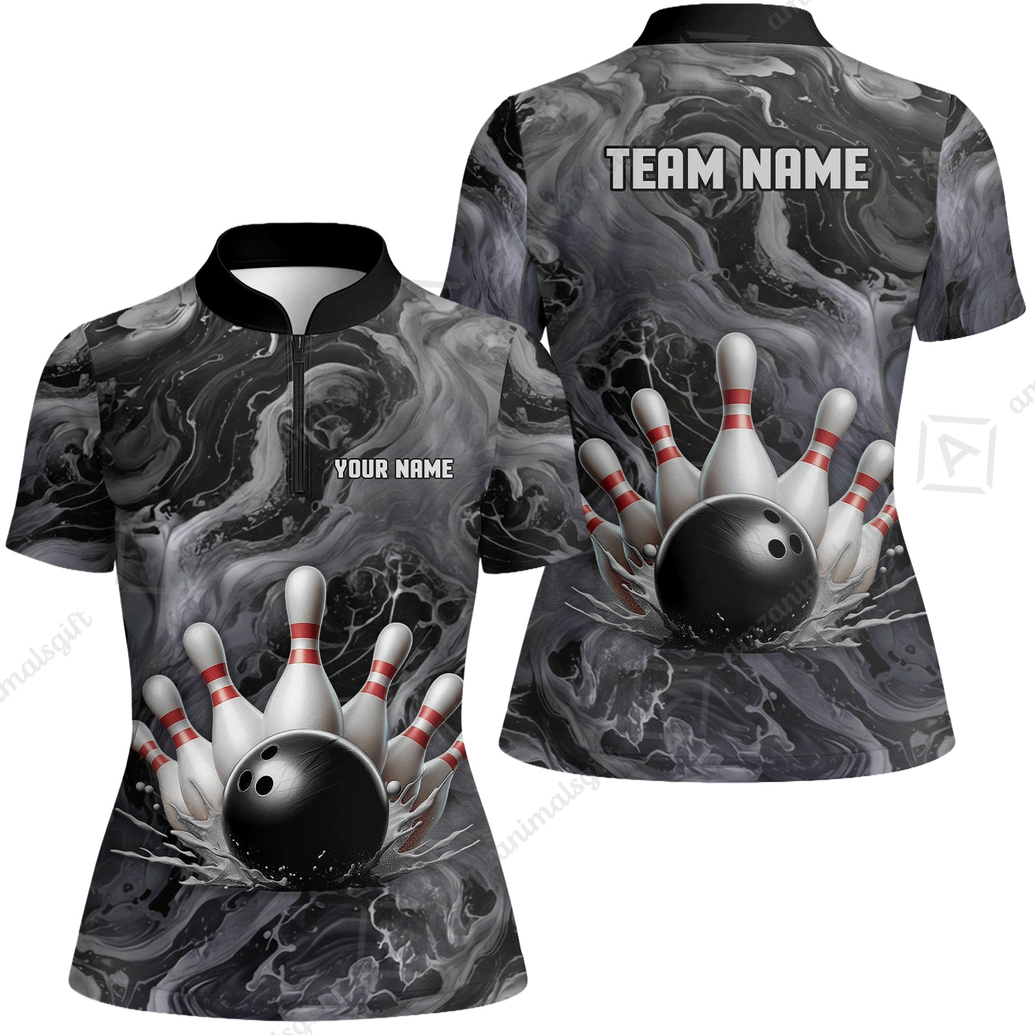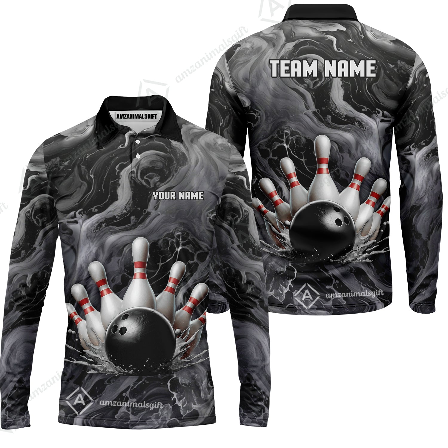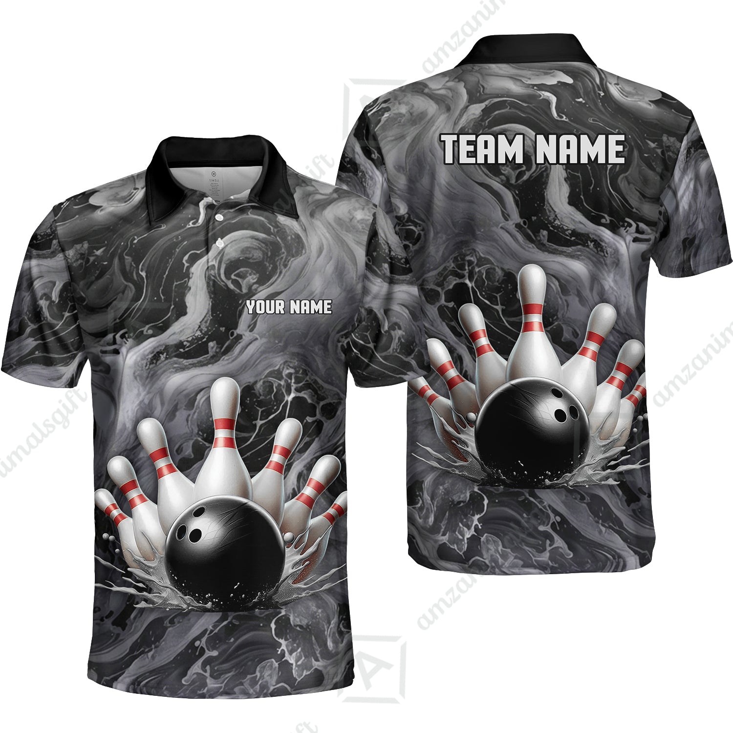 Custom Bowling Team Unisex Polo Shirt, Black Pearl Urethane Bowling Ball Marble Smoke Design for Bowlers