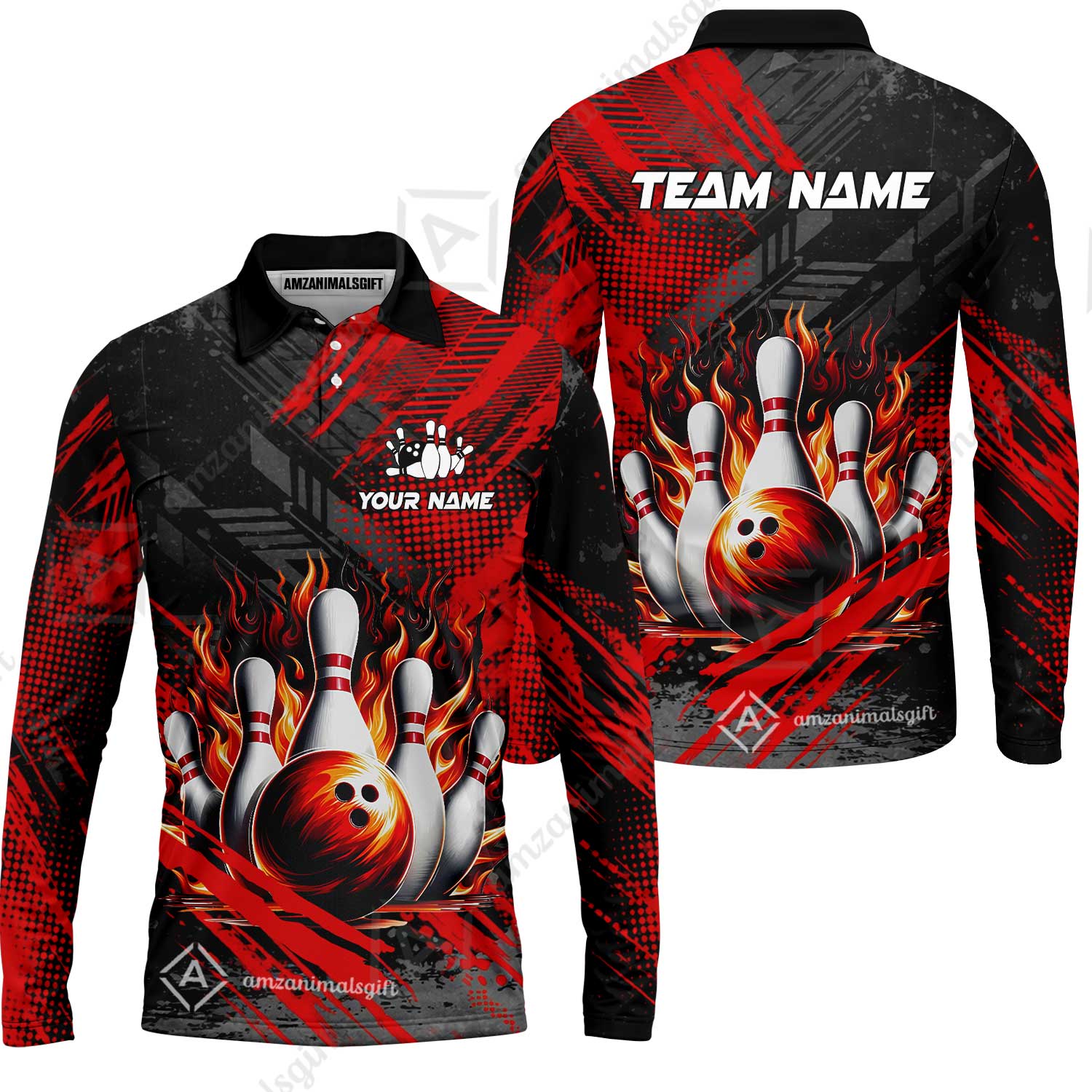 Custom Bowling Team Quarter-Zip Polo Shirt, Personalized Flame Bowling Jersey with Name & Team Name for Men & Women