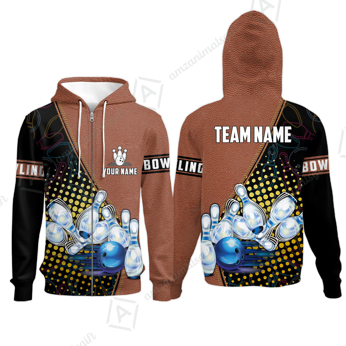 Custom Bowling Zip Hoodie - Black And Blue Bowling Ball Pattern Personalized Name Zip Hoodie