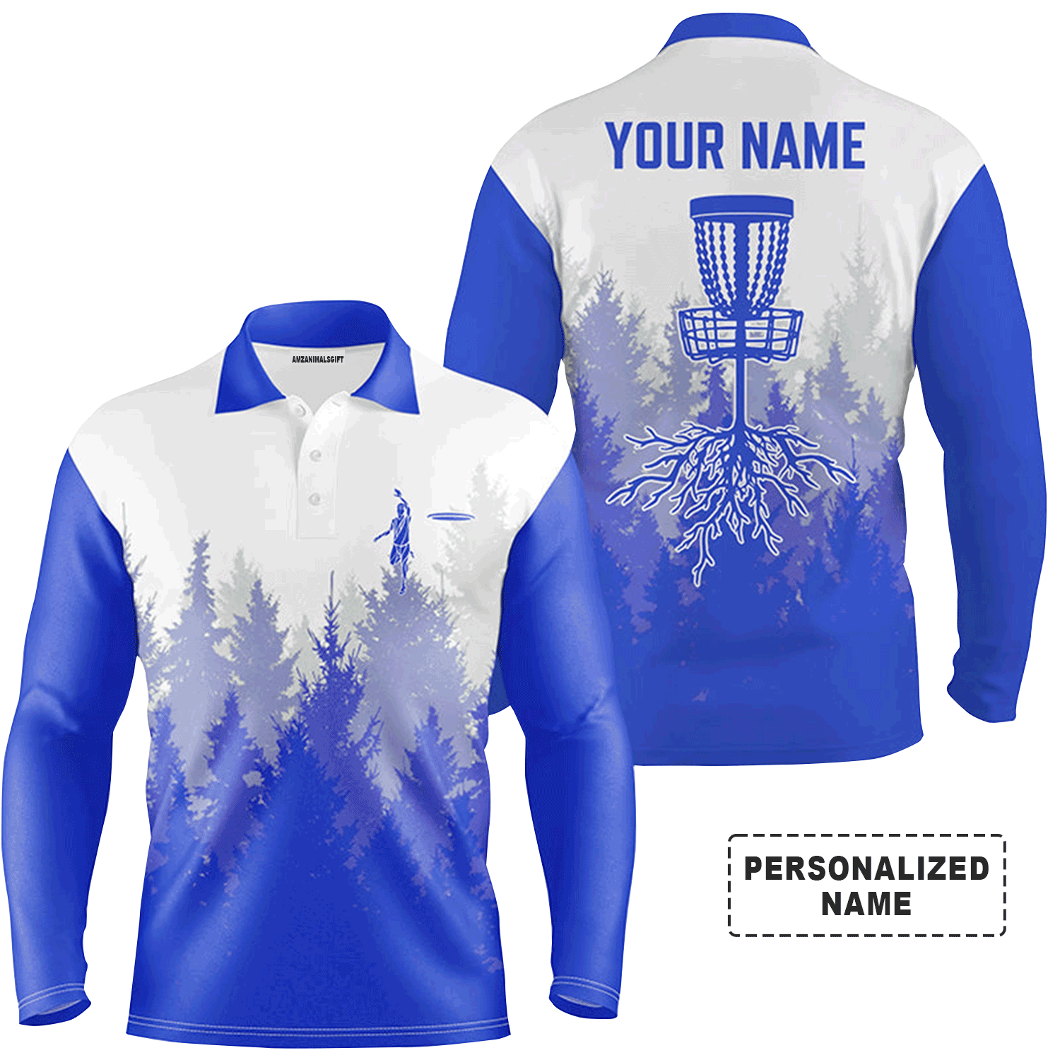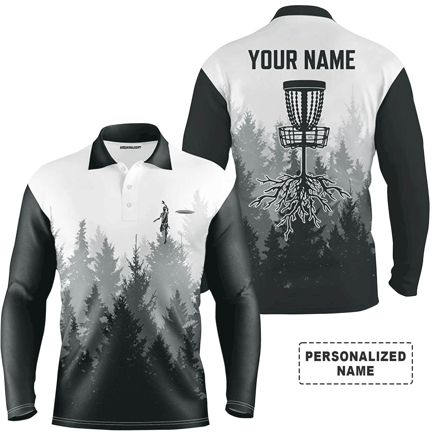 Custom Disc Golf Long Sleeve Men Polo Shirt - Disc Golf Basket Hole In The Woods Custom Name Multicolor Apparel For Men, Disc Golf Lover