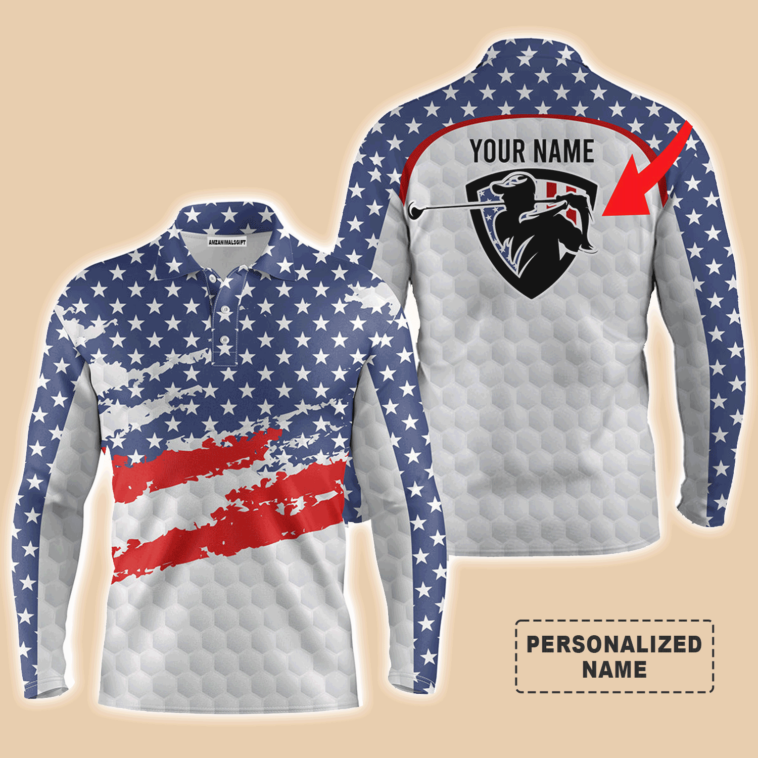 Custom Golf Long Sleeve Men Polo Shirt - American Flag Custom Name And Logo Team Golf Men Polo Shirt For Golf Lover
