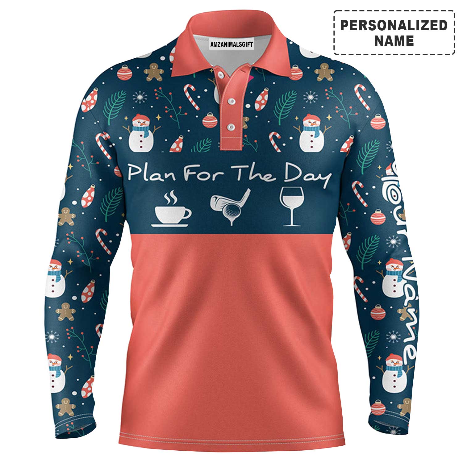 Custom Golf Long Sleeve Men Polo Shirt - Christmas Pattern Snowman Custom Name Apparel, Plan For The Day Coffee Golf Wine - Personalized Gift For Men, Golf Lover