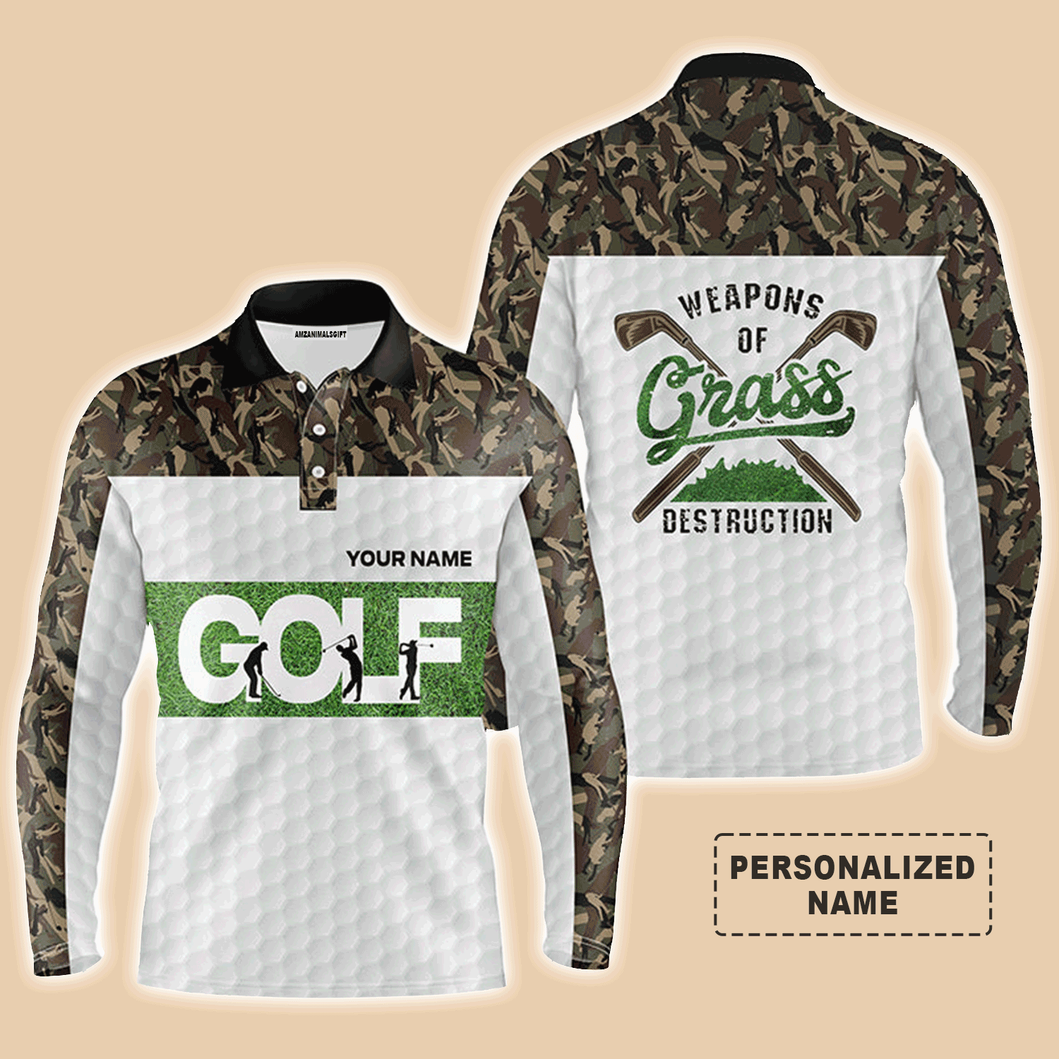 Custom Golf Long Sleeve Men Polo Shirt - Weapon Of Grass Destruction Camo Pattern White Background Men Polo Shirts For Golf Lover