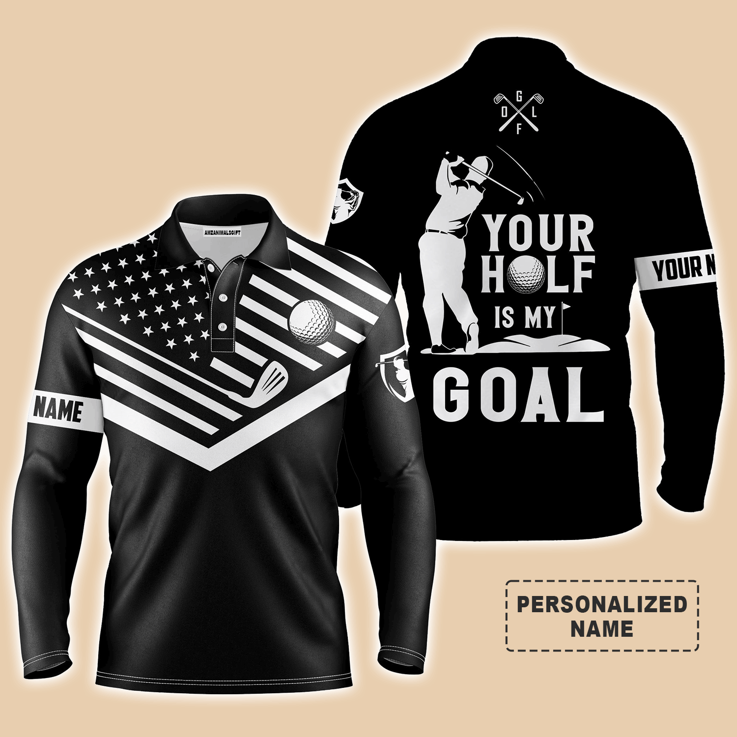 Custom Golf Men Polo Shirts - Your Hole Is My Goal Custom Name Polo Shirt, Personalized Black American Flag Golf Shirt - Perfect Gift For Men, Golfers