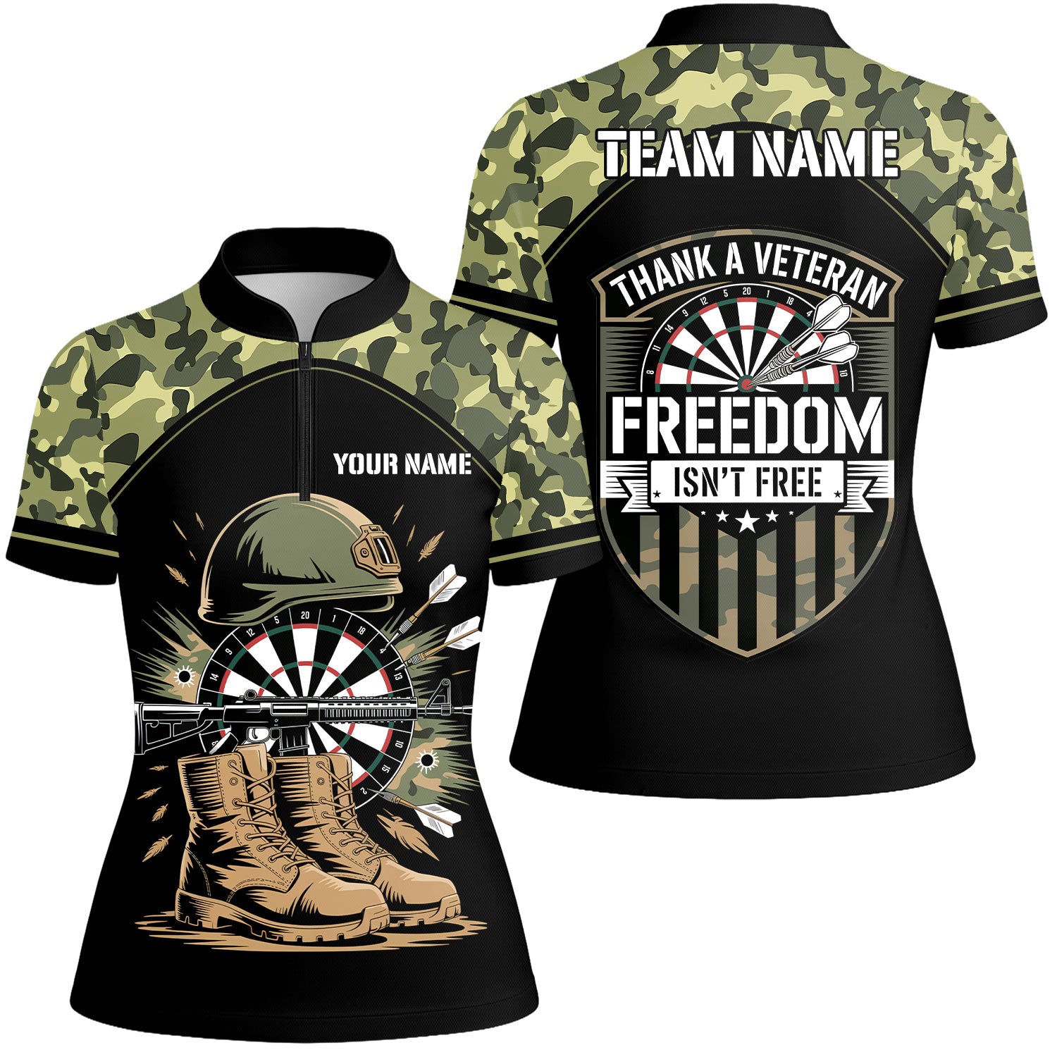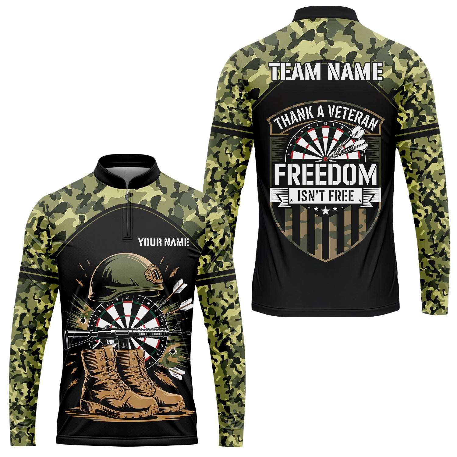 Custom Military Green Camouflage Dartboard Collar Quater-Zip Jersey Team Shirts, Customized Name Team Name Darts Team Jerseys Uniform
