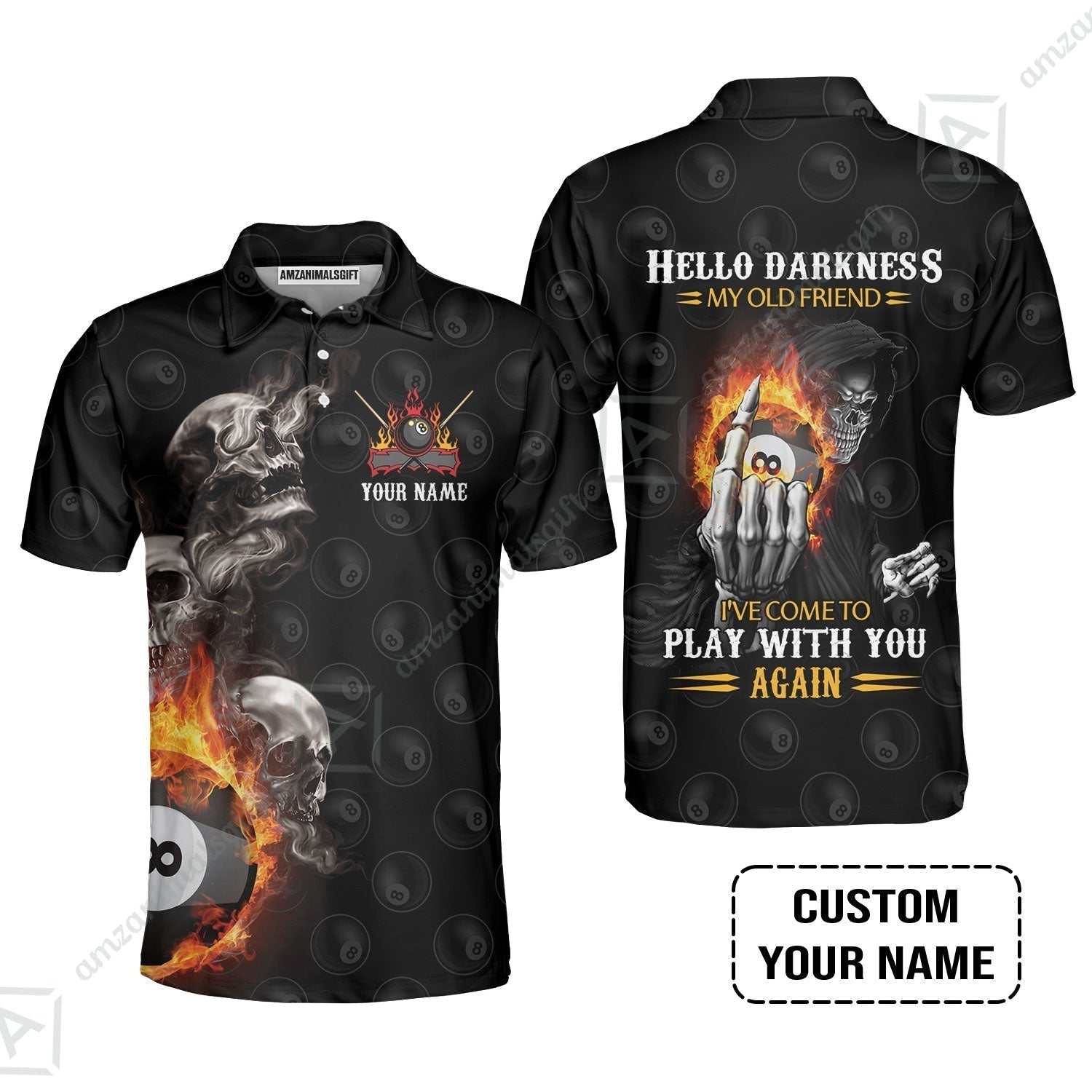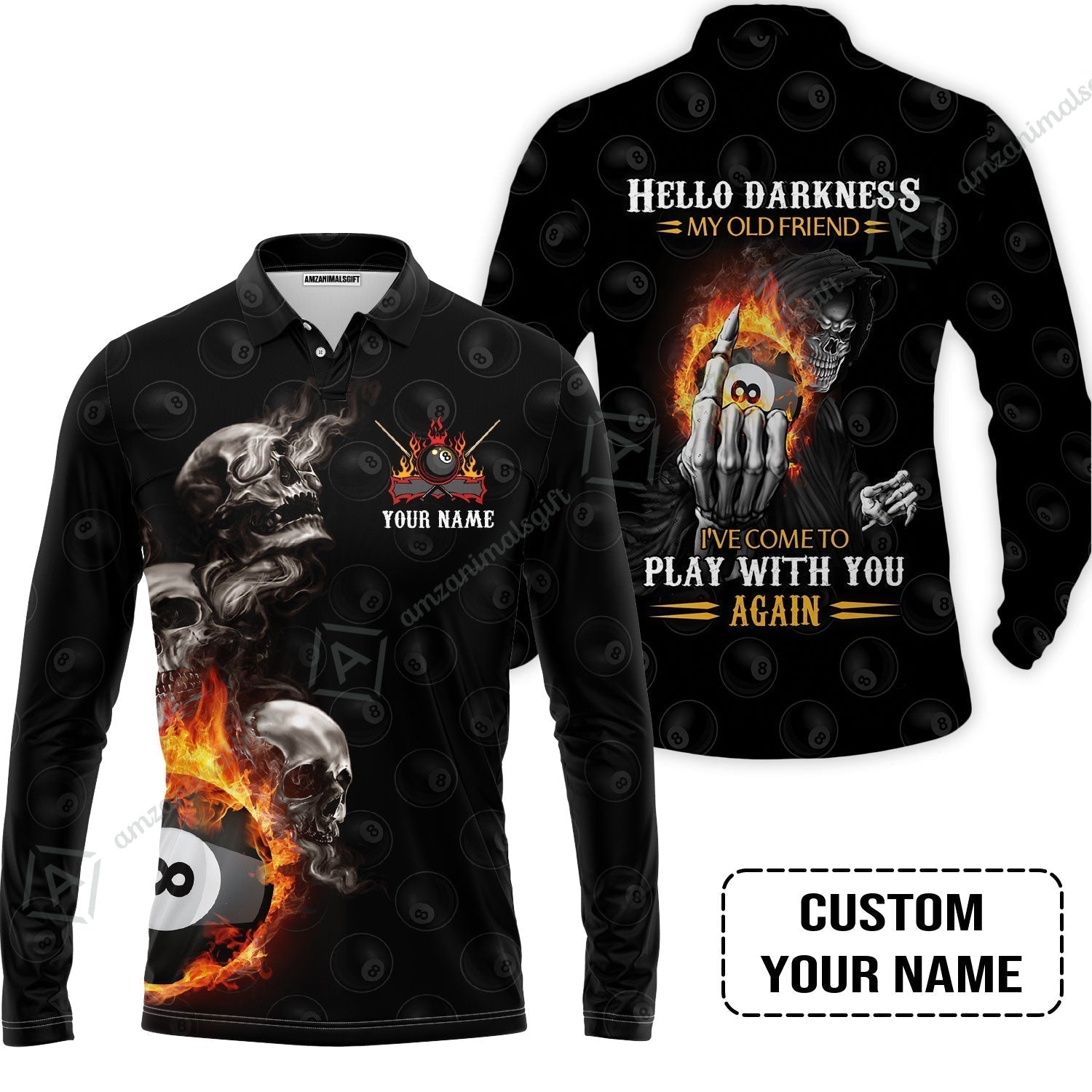 Custom Name Billiard Hawaiian Shirt, Personalized Skull Reaper 8 Ball Pool Billiards, Hello Darkness My Old Friend Hawaiian Shirt