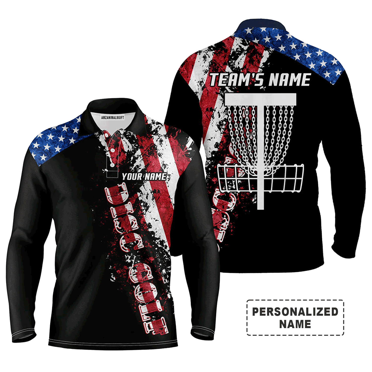 Custom Name Disc Golf Men Polo Shirt - American Flag Disc Golf Basket Apparel - Personalized Gift For Golf Lover, Men, Husband, Team, Patriotic