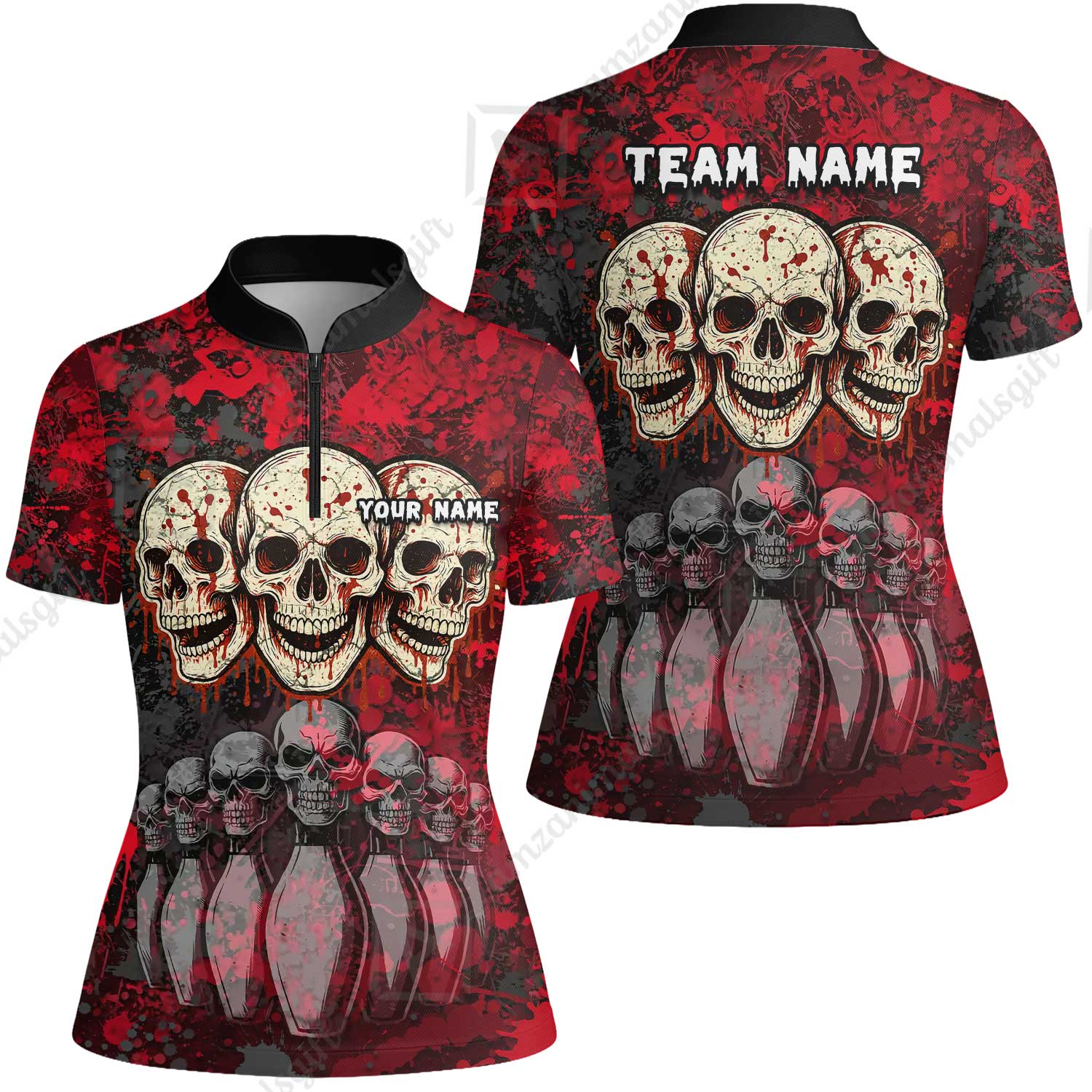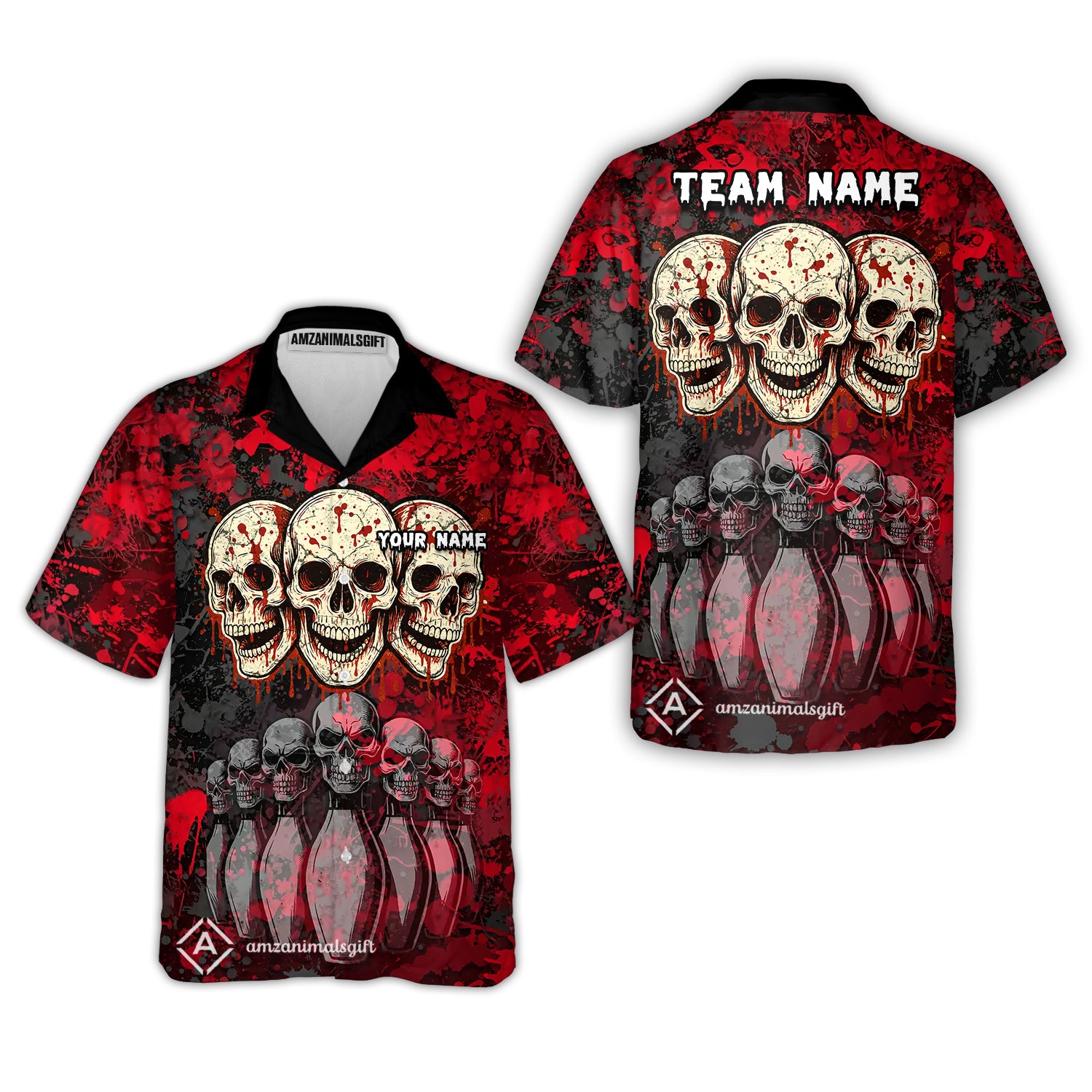 Custom Three Skulls with Red Blood Splash Bowling Team Shirt, Bowling uniforms, Bowling Shirt Personalized Name And Team Name