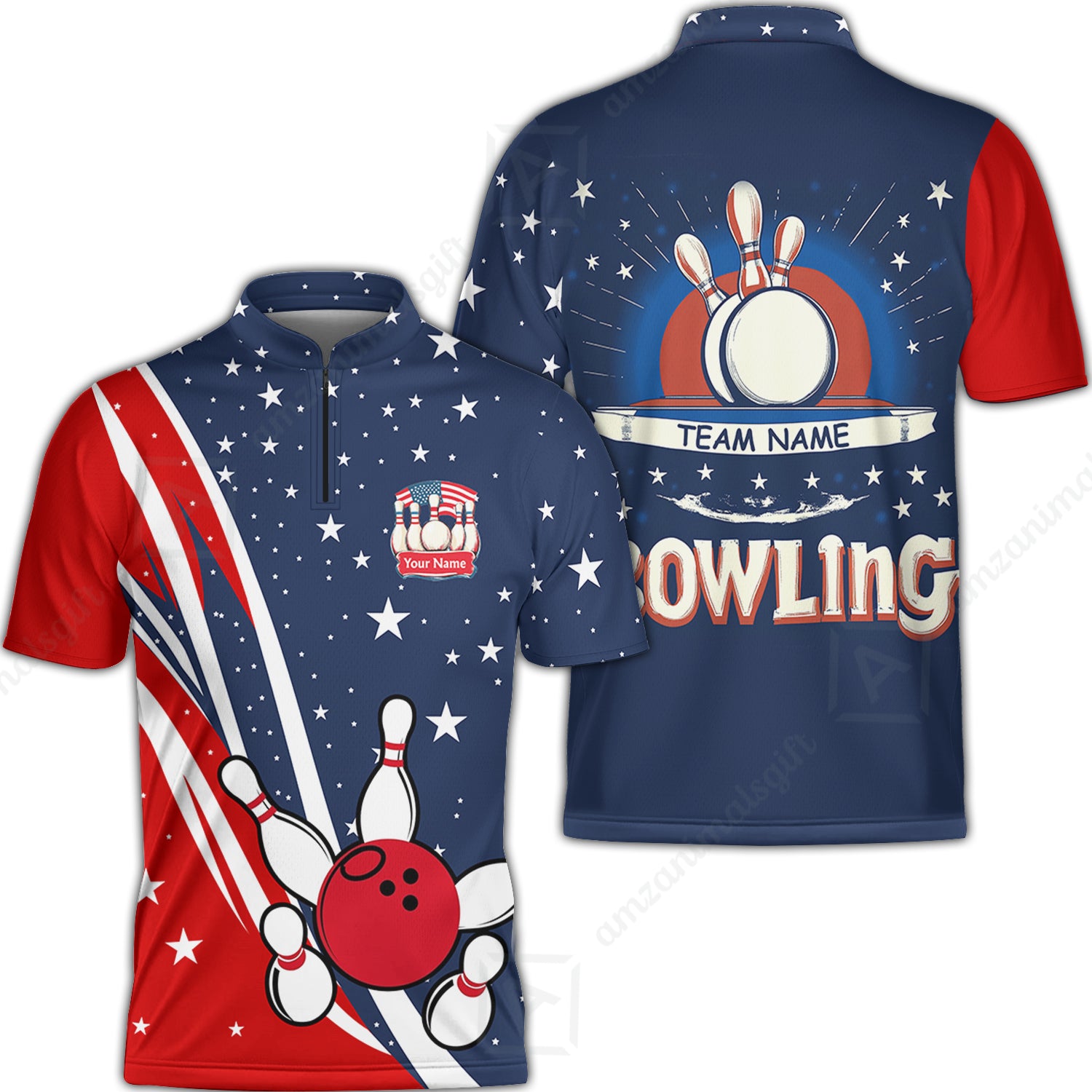 Customized Bowling Patriotic Jersey, Red White Blue Theme Quarter-zip Stand Collar Shirt, Perfect For Bowling Team