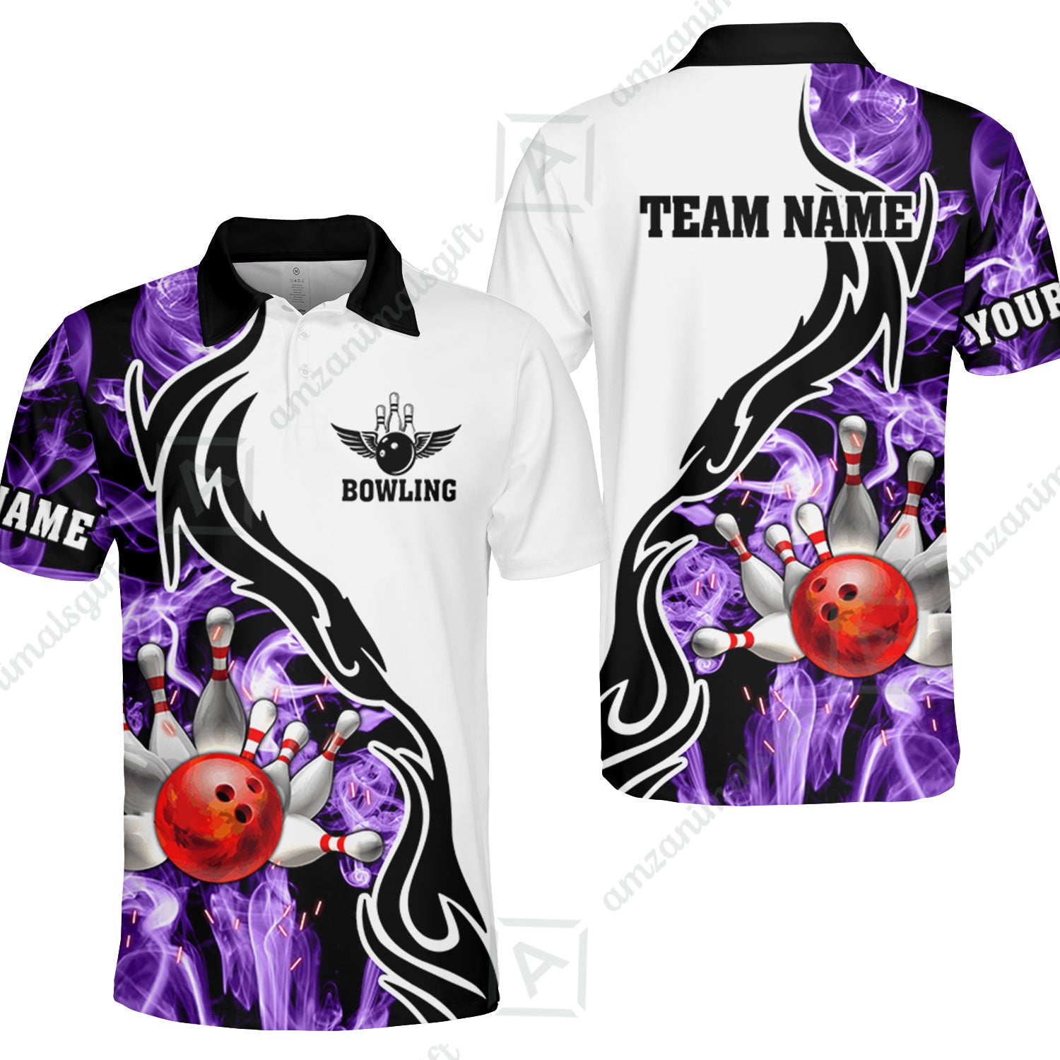 Customized Bowling Unisex Polo Shirt, Bowling And Pins Purple Smoke Pattern Customized Name And Team Polo Jerseys Shirts