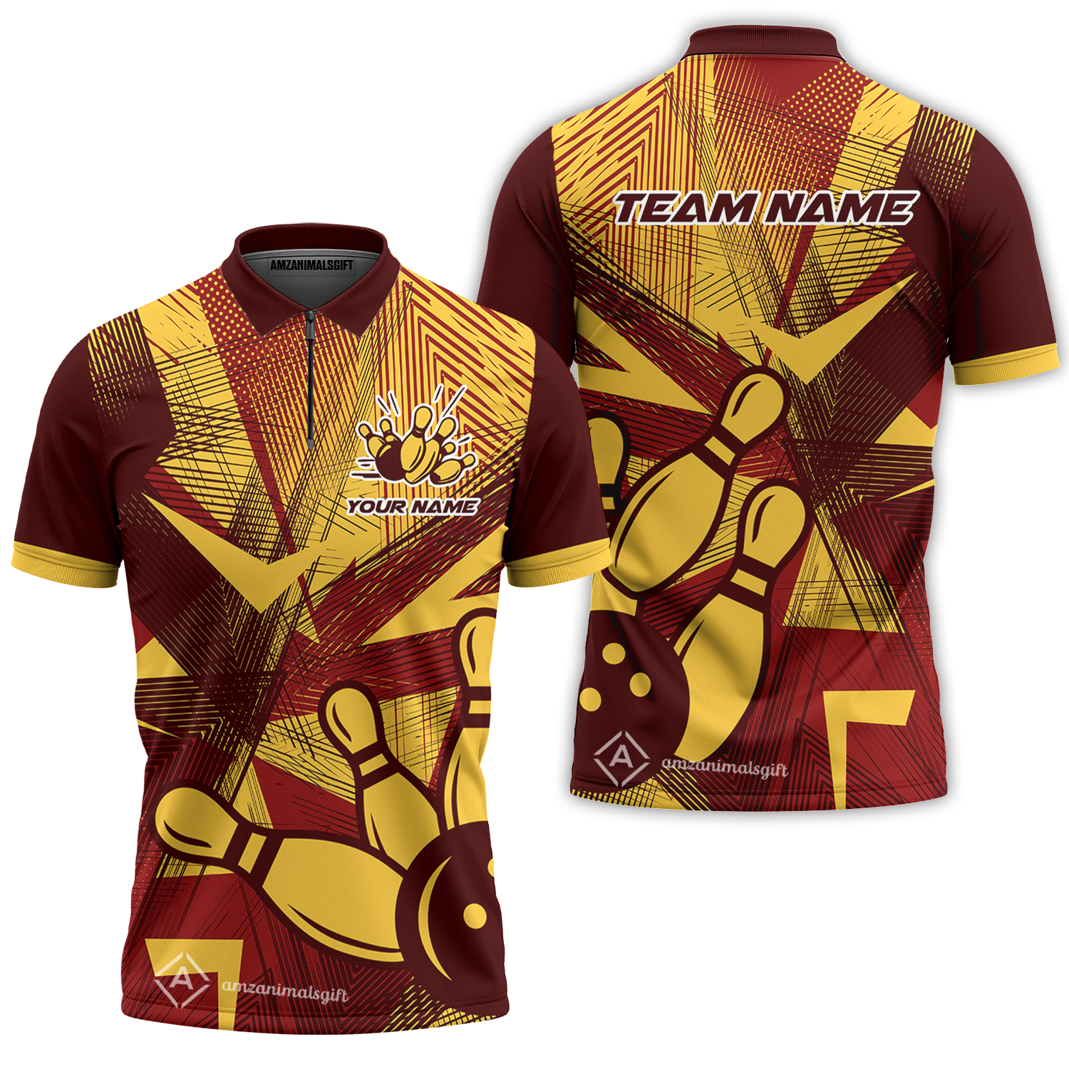 Customized Bowling Quarter-Zip Polo Shirt, Bowling Ball And Pins Esports Pattern Zip Polo Shirt Uniform For Bowlers