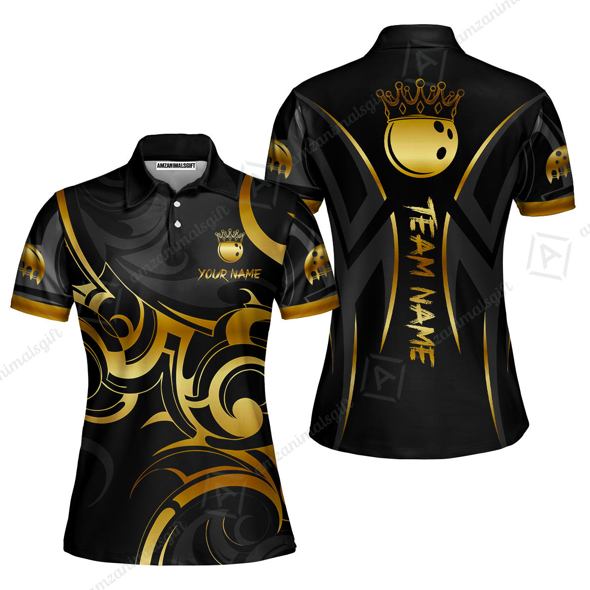 Customized Bowling Team Women Polo Shirt, Bowling Swirling Fire Flames Gold And Black Style Polo Shirt For Bowlers