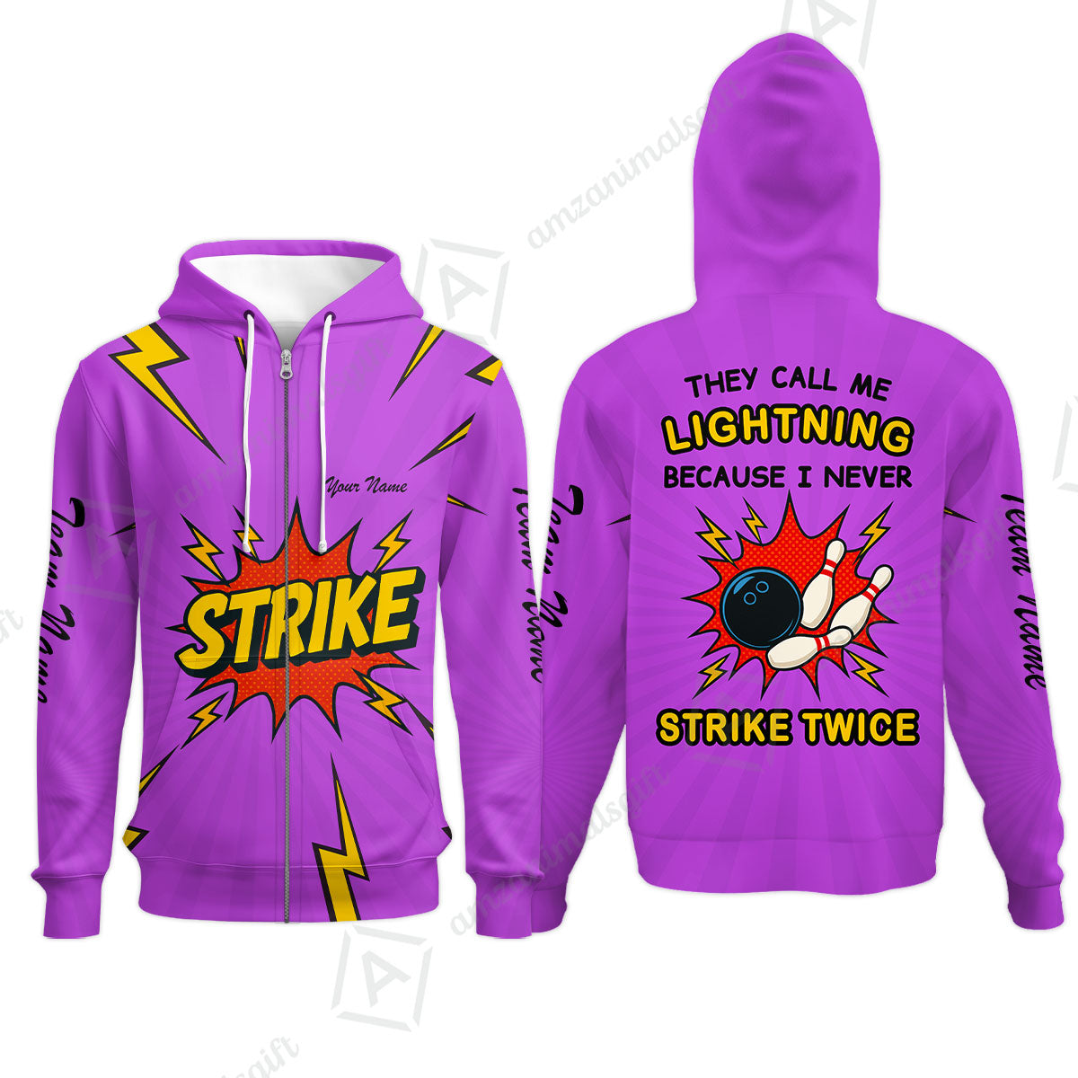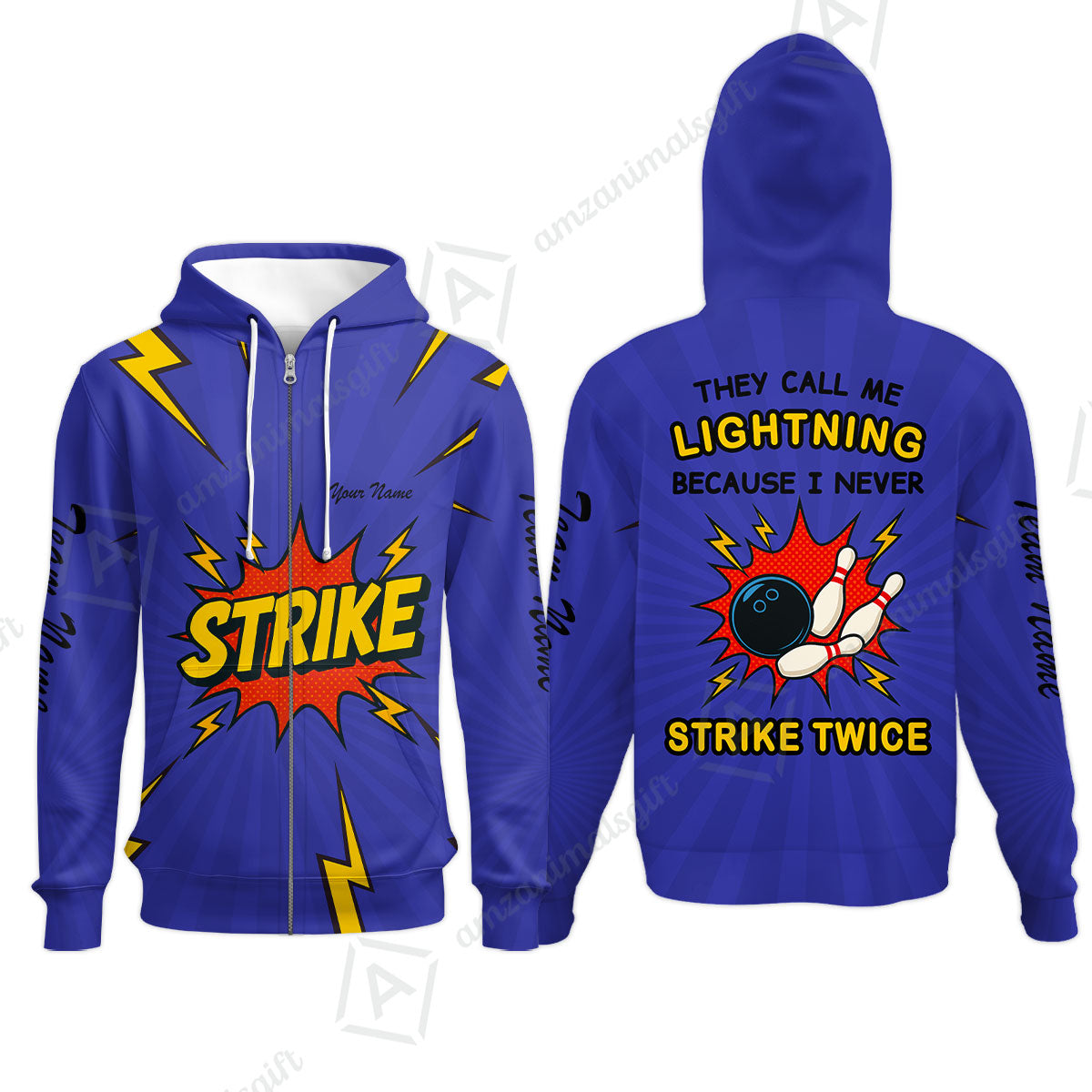 Customized Bowling Team Zip Hoodie, They Call Me Lightning Because I Never Strike Twice Comic Style Zip Hoodie