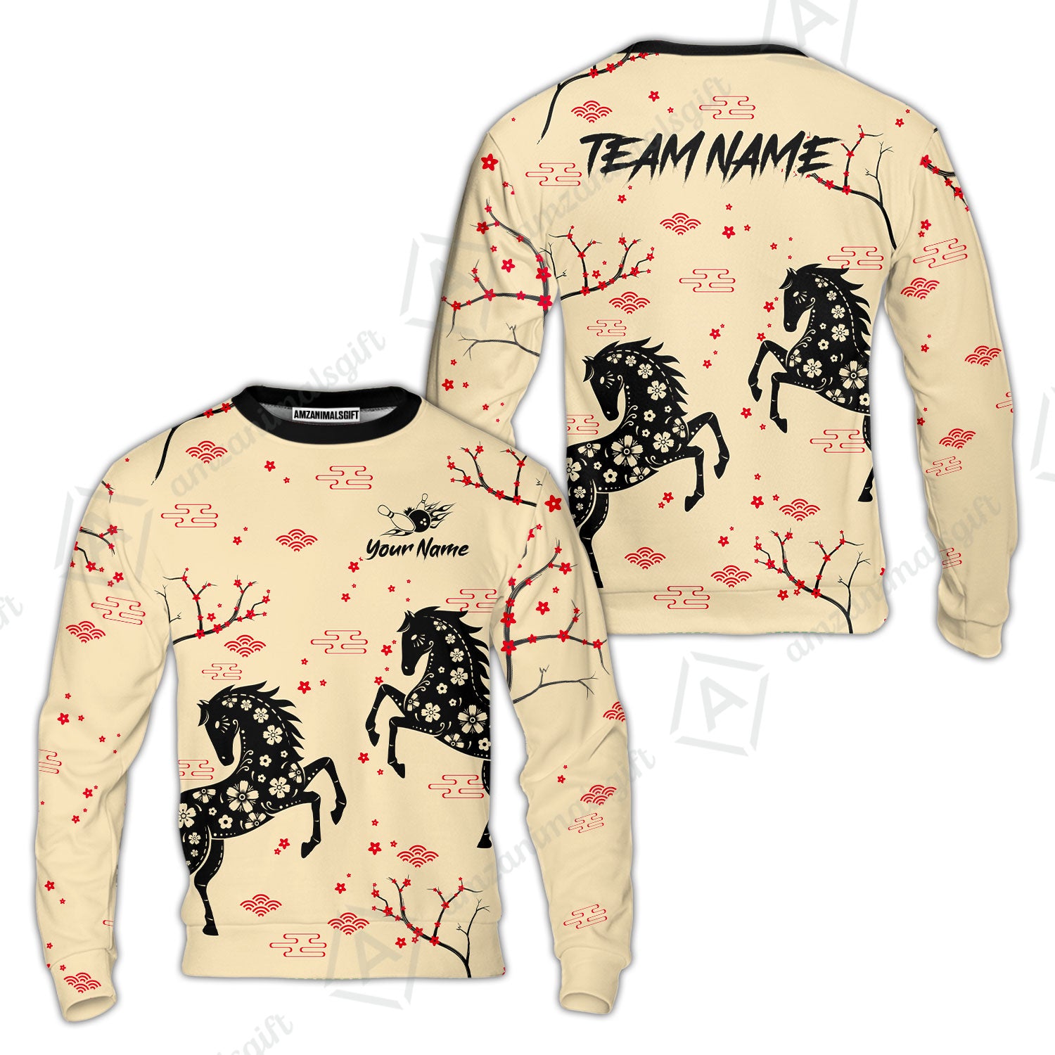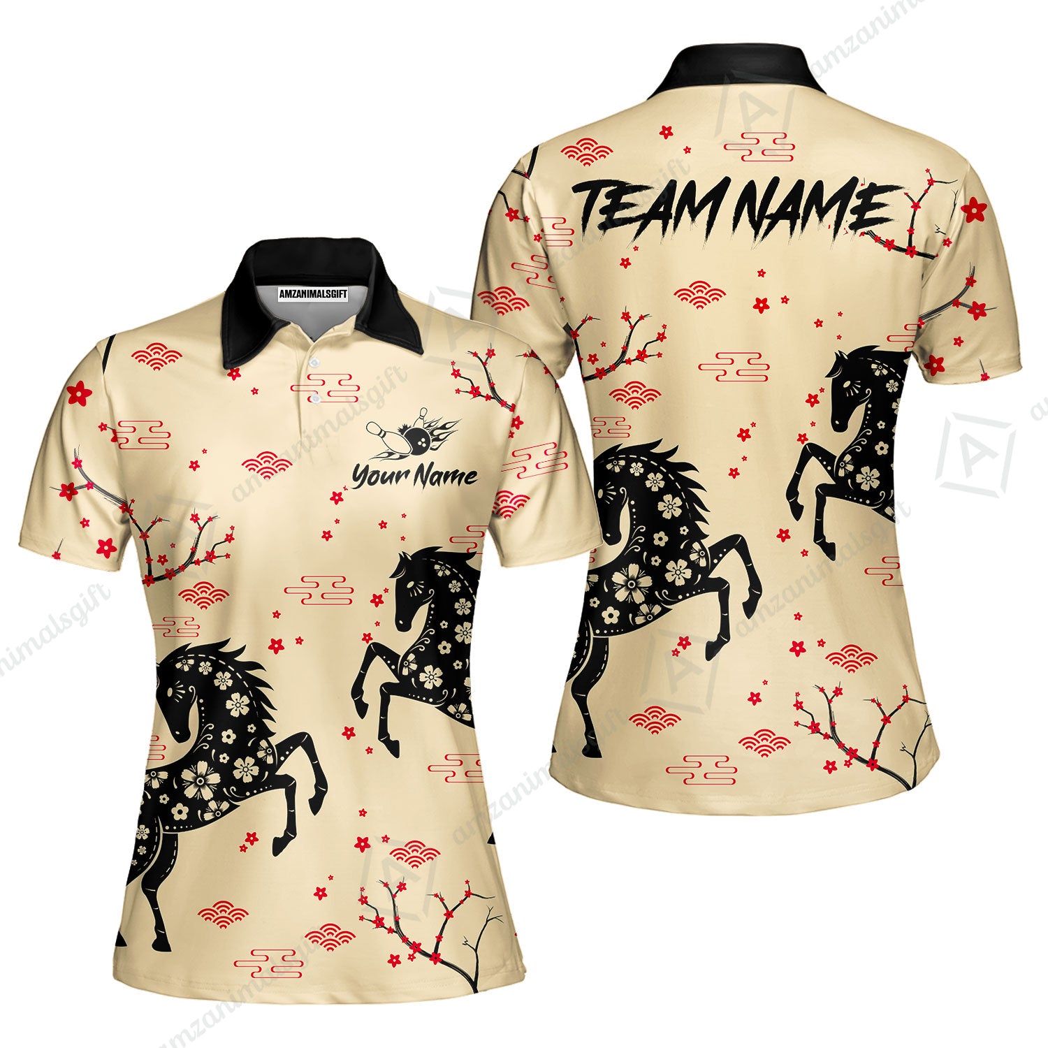 Customized Bowling Unisex Polo Shirt, Floral Pattern Horse Cherry Blossom, Bowling Uniform - Personalized Name Team Name