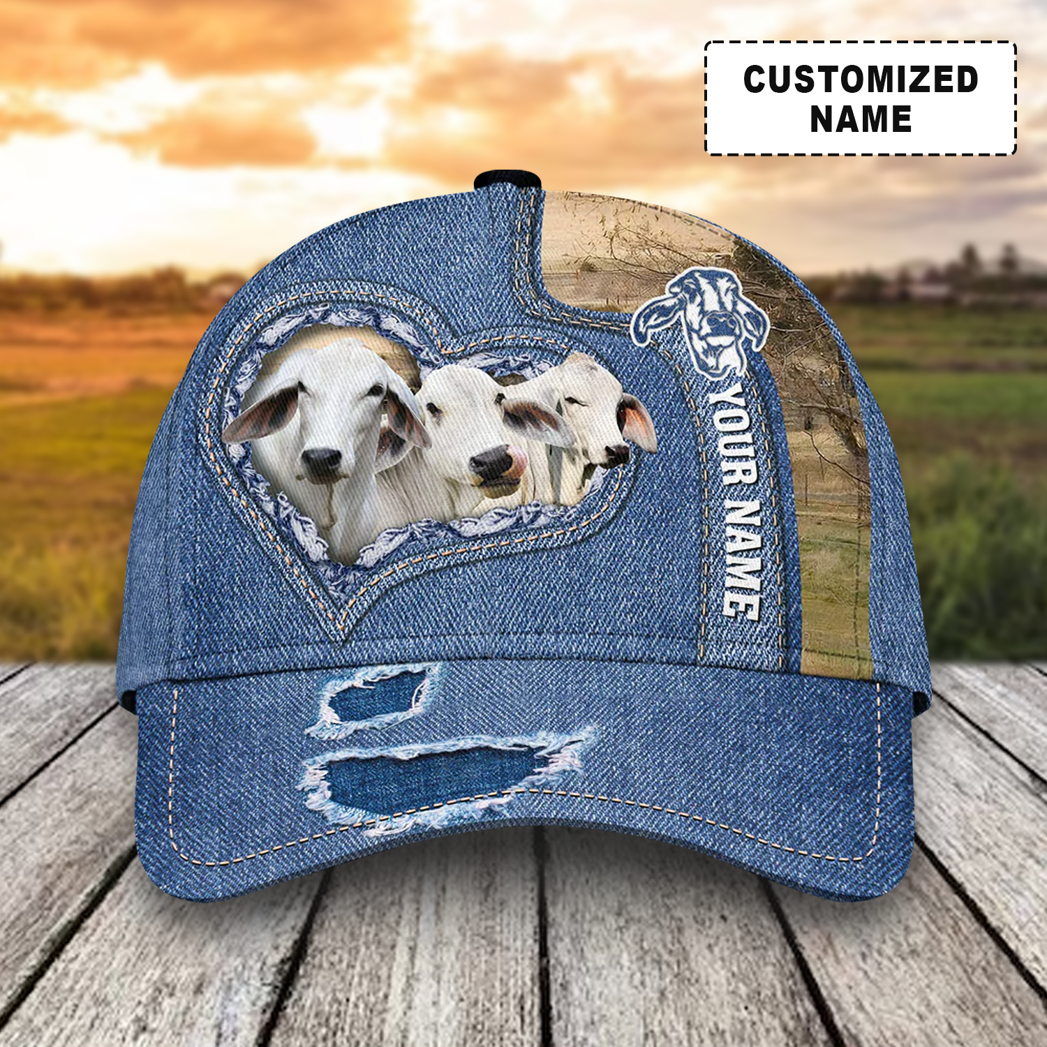 Customized Brahman Cattle Cow Caps, Brahman White And Denim Pattern Hats, Best Dairy Farm Hat For Men Women Farmer