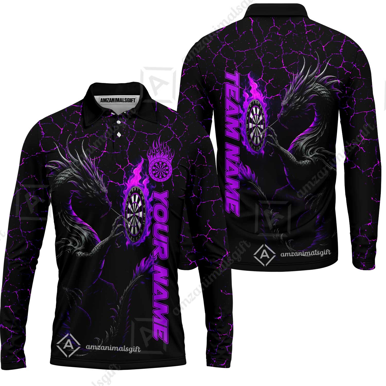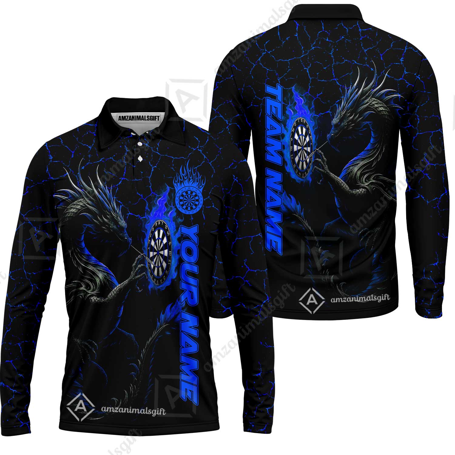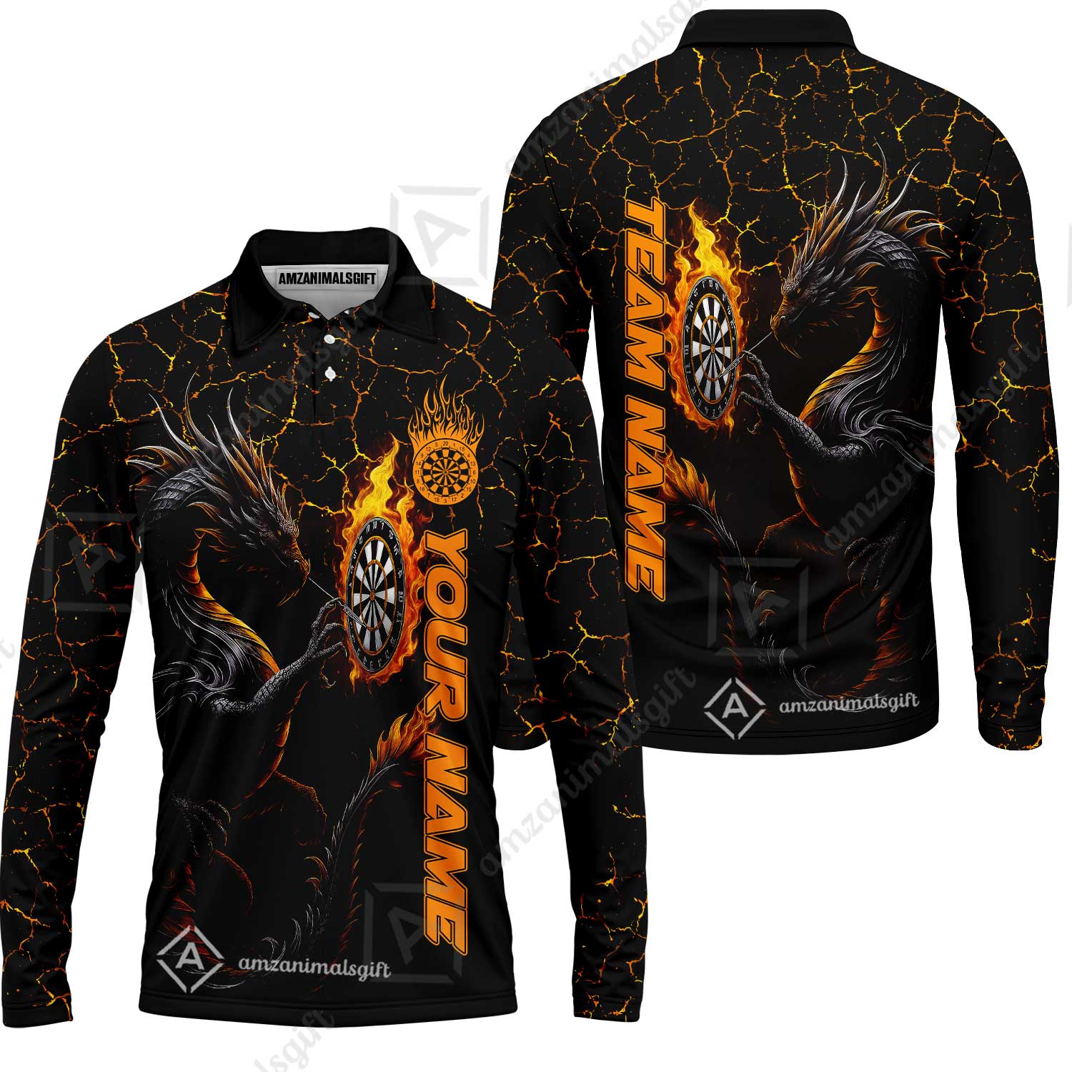 Customized Darts Long Sleeve Polo Shirt, Big Dragon Dartboard Flame Darts Team Style Long Sleeve Polo Shirt for Players, Jersey for Darts Players