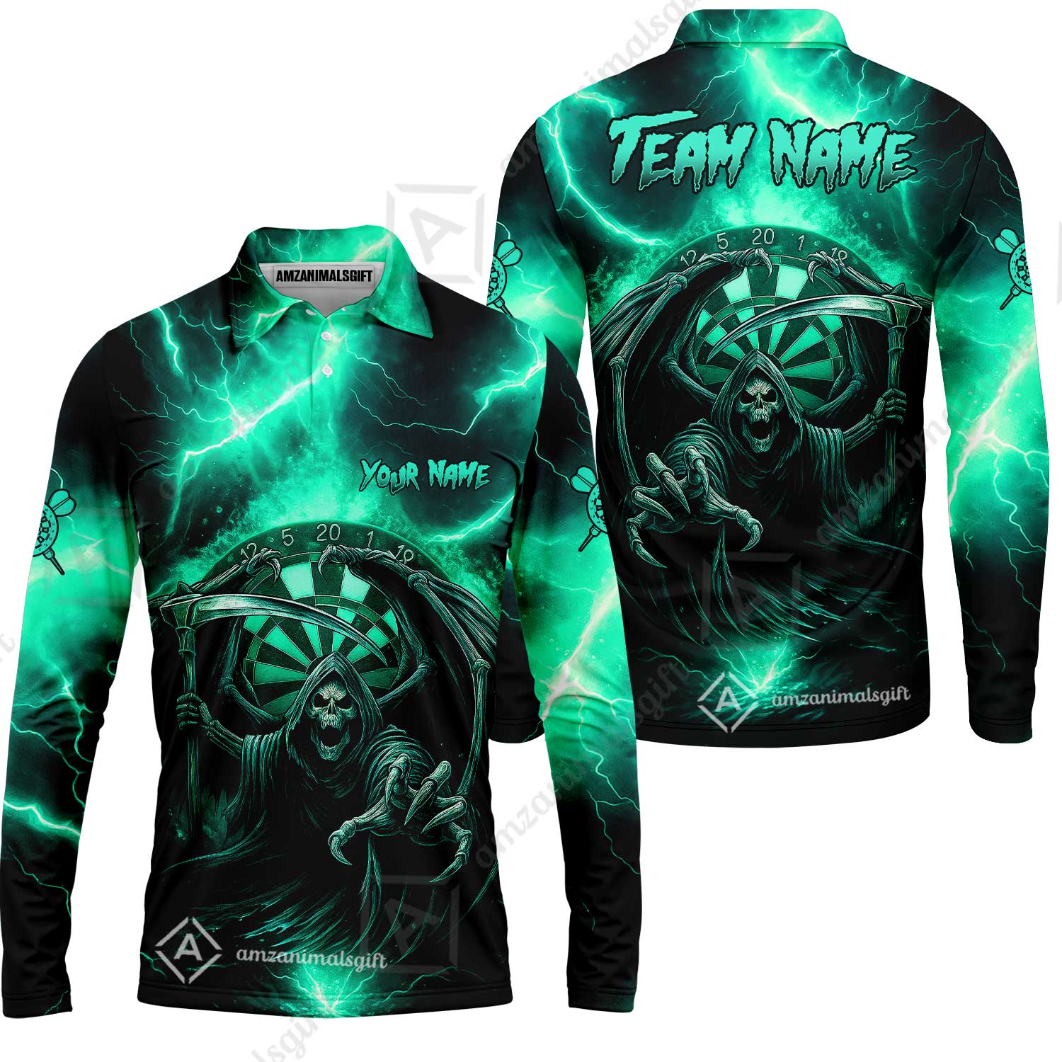 Customized Darts Long Sleeve Polo Shirt, Darts Grim Reaper Thunder Lightning Turquoise And Blue Team Long Sleeve Polo Shirt Jersey For Darts Player