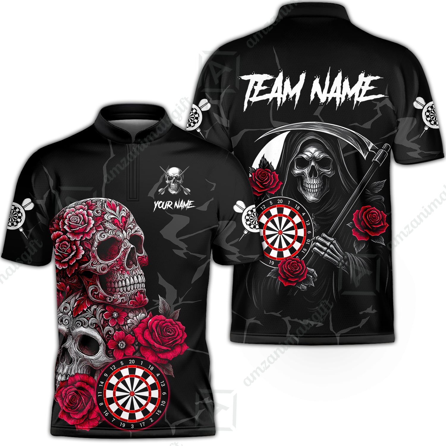 Customized Darts Stand Collar Quarter-Zip Shirt, Darts Turquoise Skull Roses Dartboard Style Jersey for Darts Players