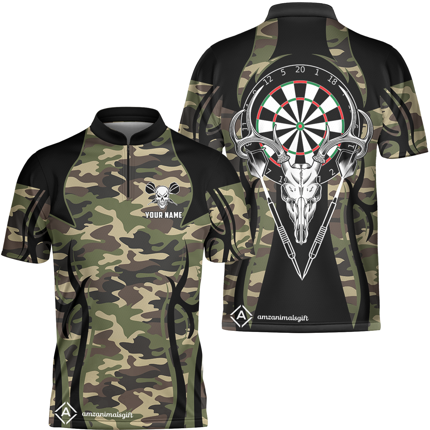 Customized Darts Team Flat Neck Zipper Jersey, Camo Skull Deer Dartboard Personalized Name Team Name Shirt For Darts League