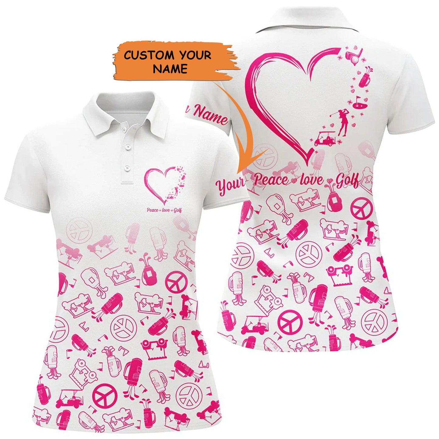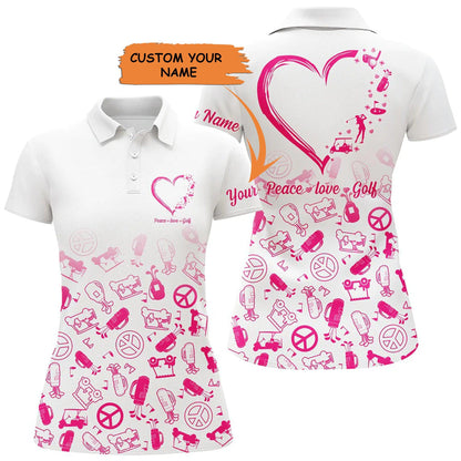 Customized Name Golf Women Polo Shirts, Heart Shirts Personalized Peace Love Golf Polo Shirts - Perfect Gift For Ladies, Golf Lovers, Golfers