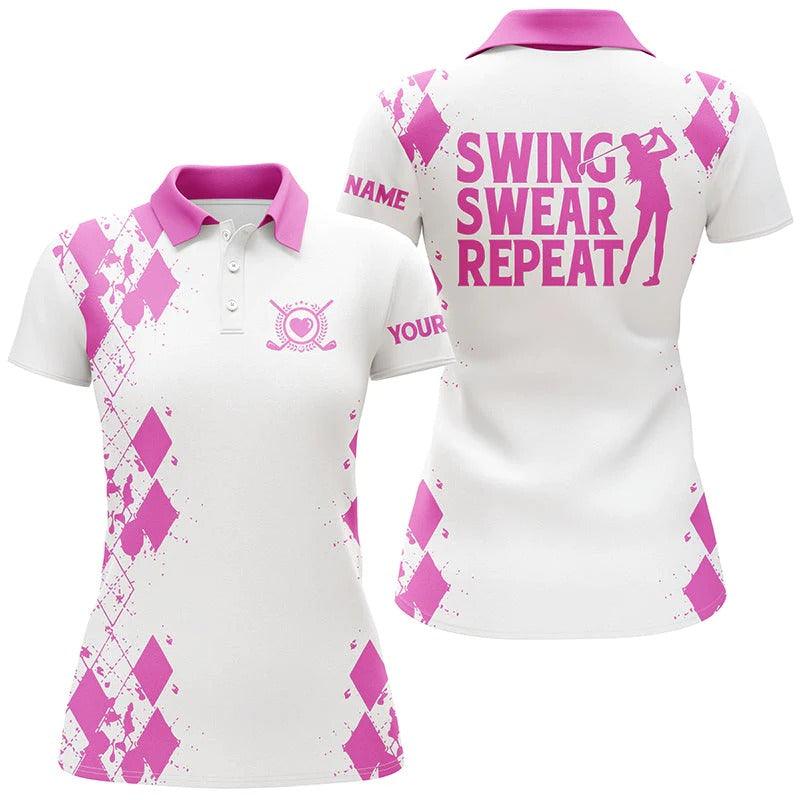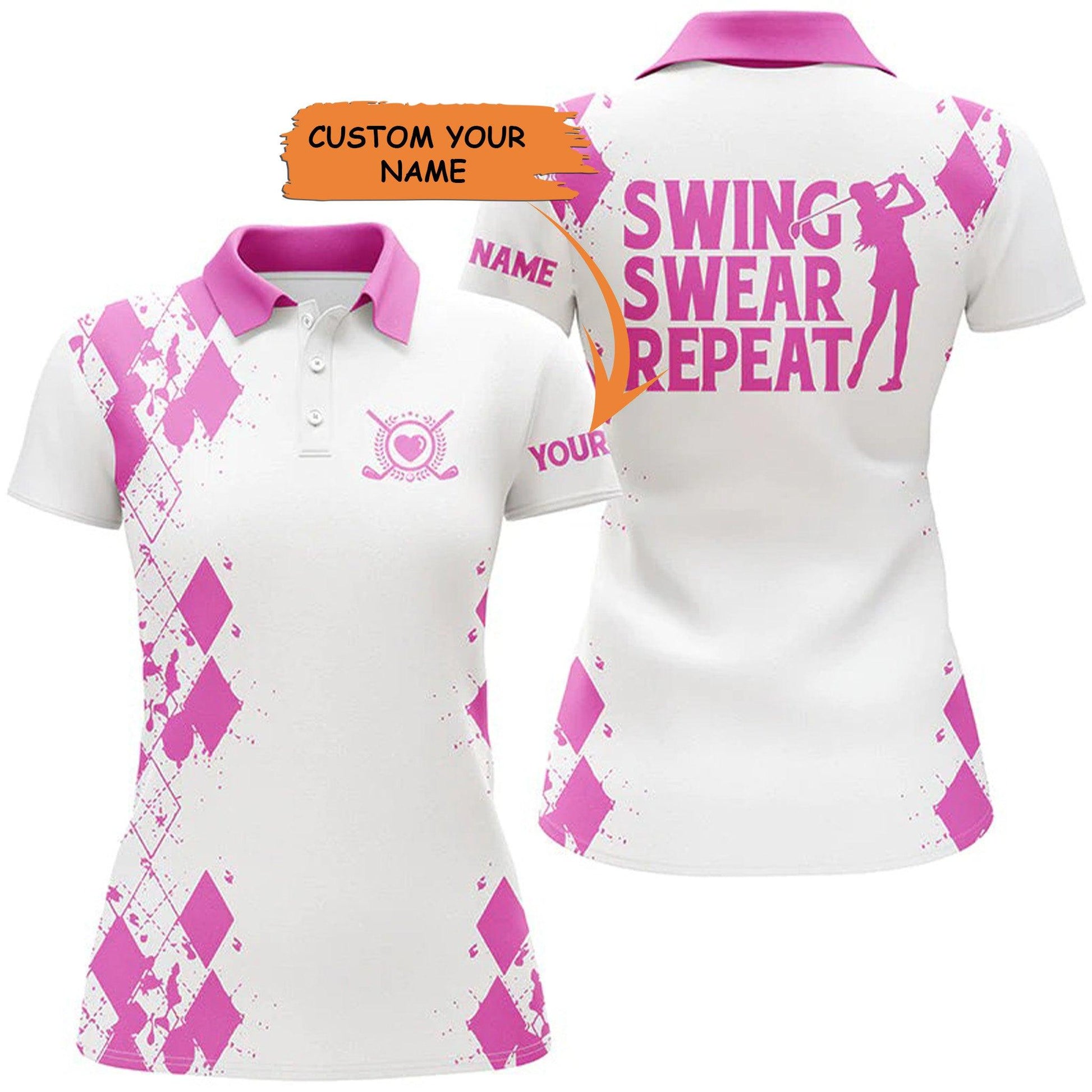 Customized Name Golf Women Polo Shirts, Personalized Swing Swear Repeat White Golf Polo Shirt - Perfect Gift For Ladies, Golf Lovers, Golfers