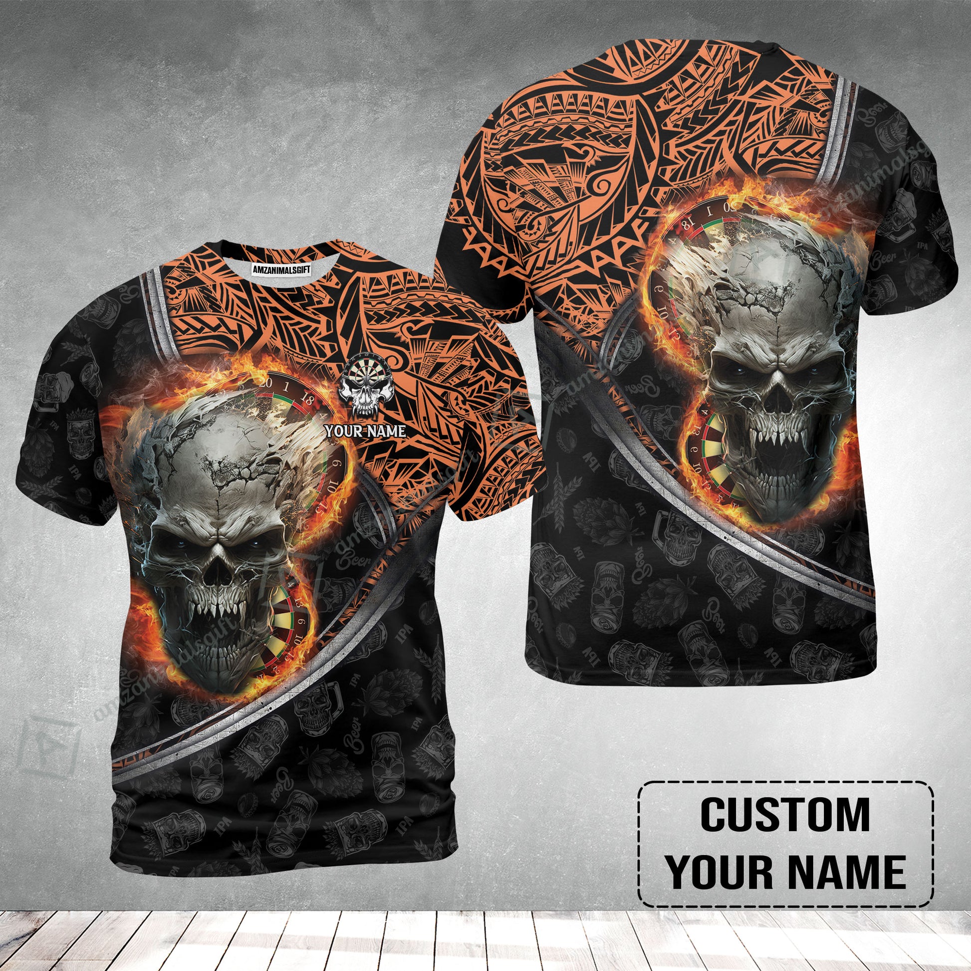 Darts Custom Name T-Shirt, Skull Maori Tattoo And Darts Custom Name T-Shirt, Flame Bullseye Dartboard Personalized T-Shirt