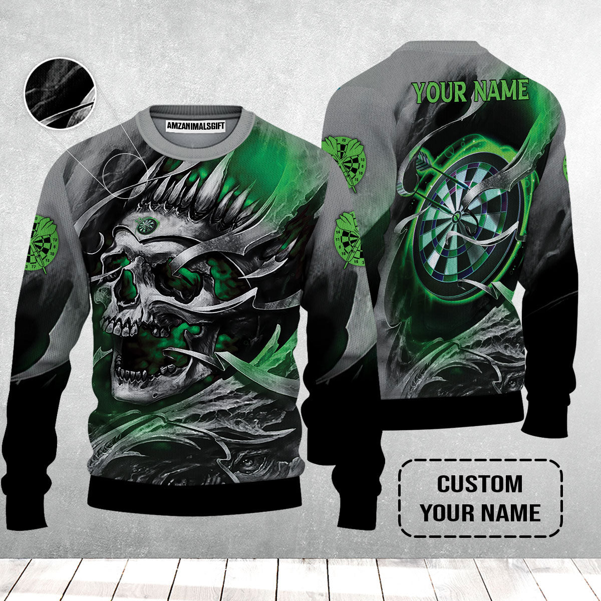 Darts Sweater Custom Name - Green Skull Dartboard Personalized Sweater For Men