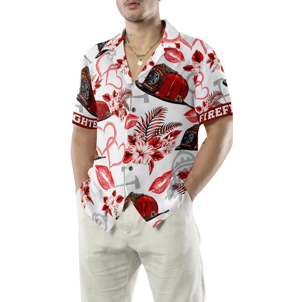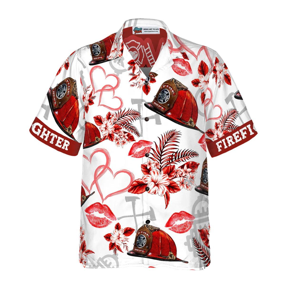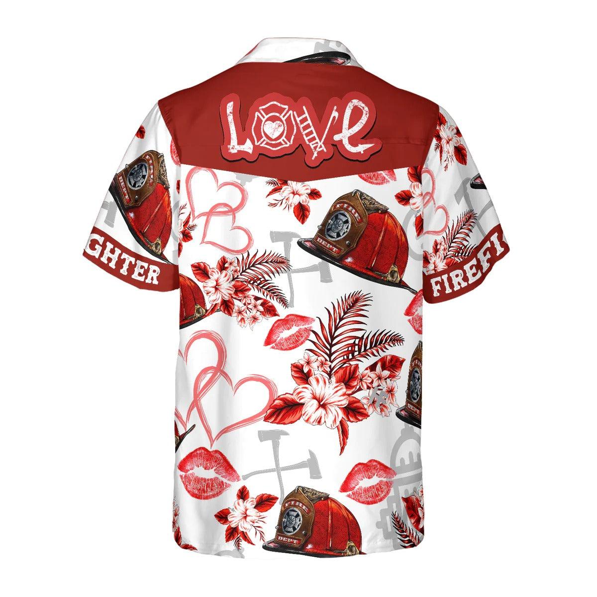 Firefighter Hawaiian Shirt, Love Firefighter Helmet Valentine Aloha Shirt, Pink Heart Red Floral Firefighter Hawaiian Shirt - Gift For Lover, Friend, Family