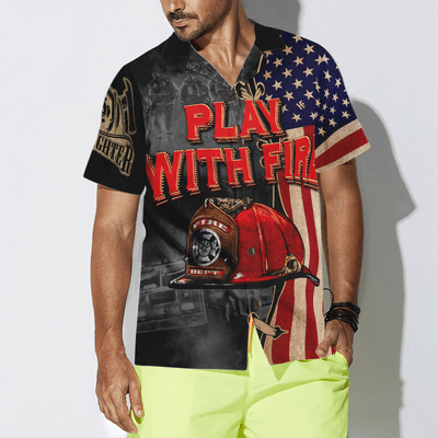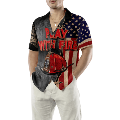 Firefighter Hawaiian Shirt, Play With Fire Firefighter Helmet American Flag Aloha Shirt For Men - Gift For Firefighter, Husband, Boyfriend, Family, Friends