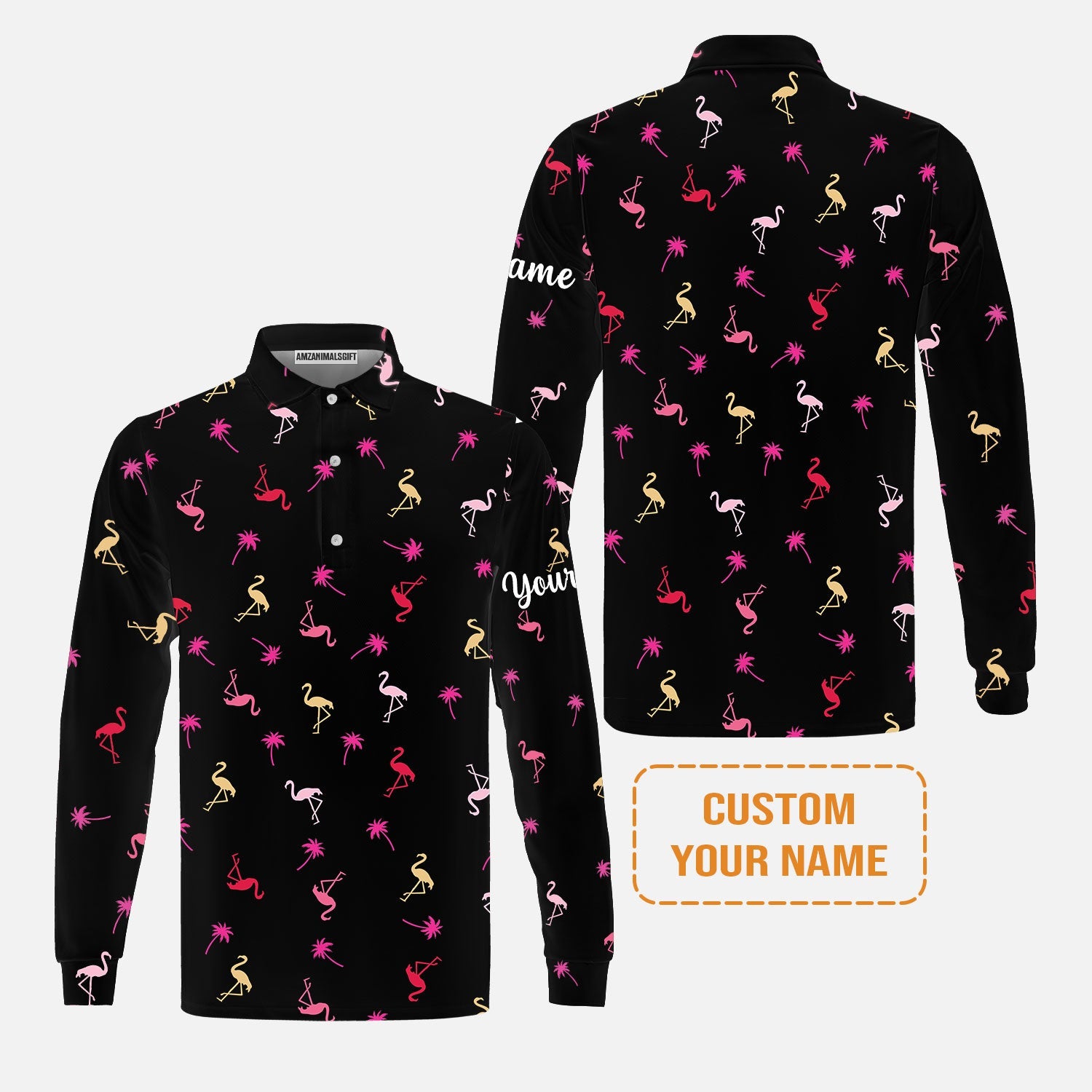 Flamingo Golf Men's Long Sleeve Polo Shirt - Custom Name Neon Pink Flamingos Palm Pattern Apparel - Personalized Gift For Golf Lover, Team, Husband, Boyfriend, Men