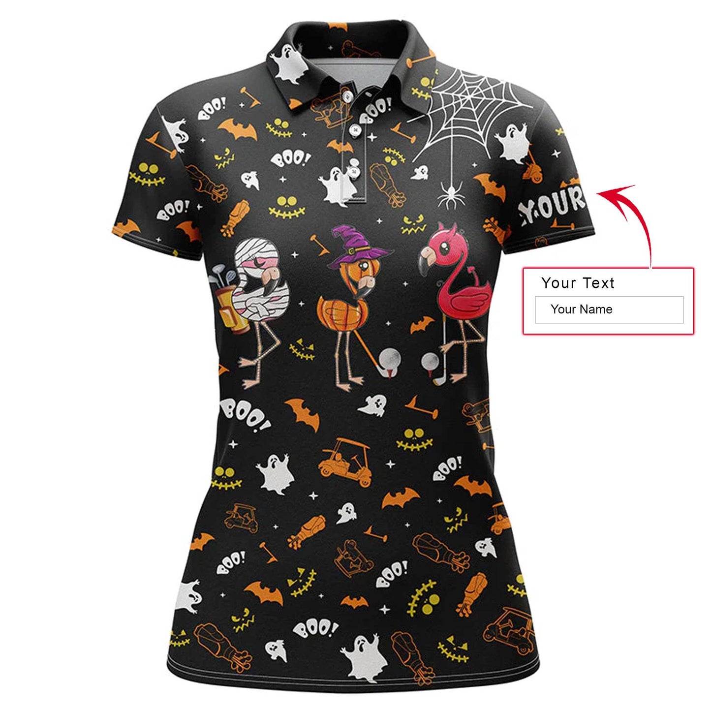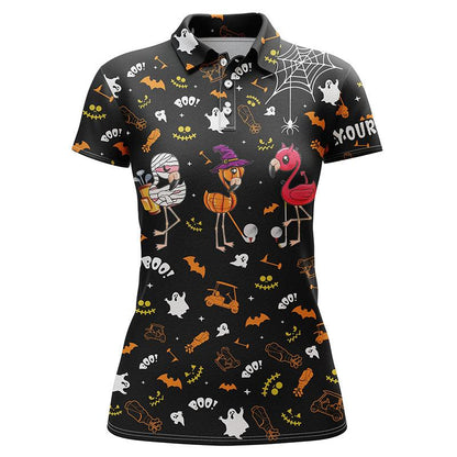 Flamingo Halloween Custom Name Women Polo Shirt, Funny Orange Black Halloween Background Personalized Women Polo Shirts, Gift For Flamingo Lovers