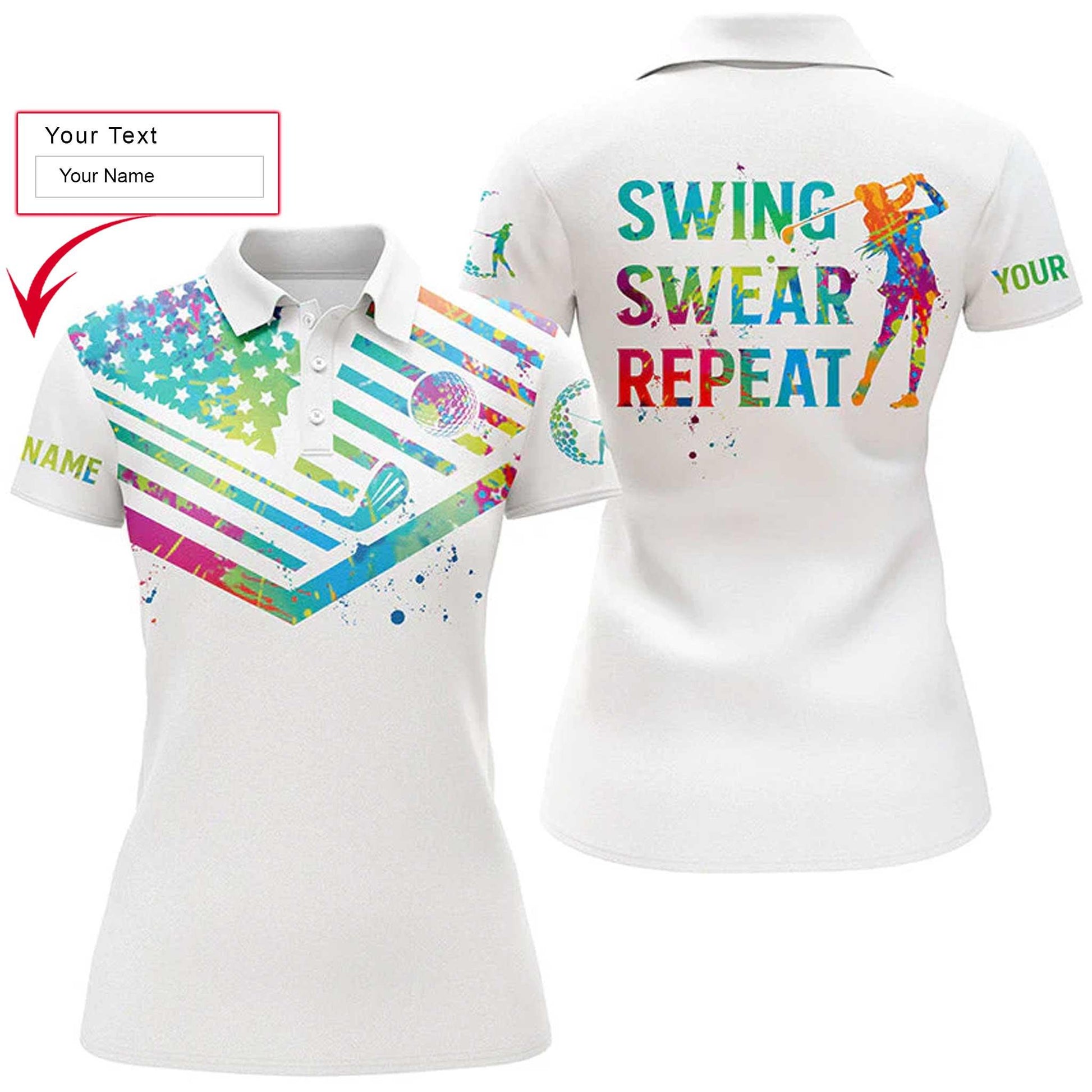 Golf Custom Name Women Polo Shirt, Watercolor American Flag, Swing Swear Repeat Personalized Women Polo Shirts, Gift For Ladies, Golf Lovers, Golfers