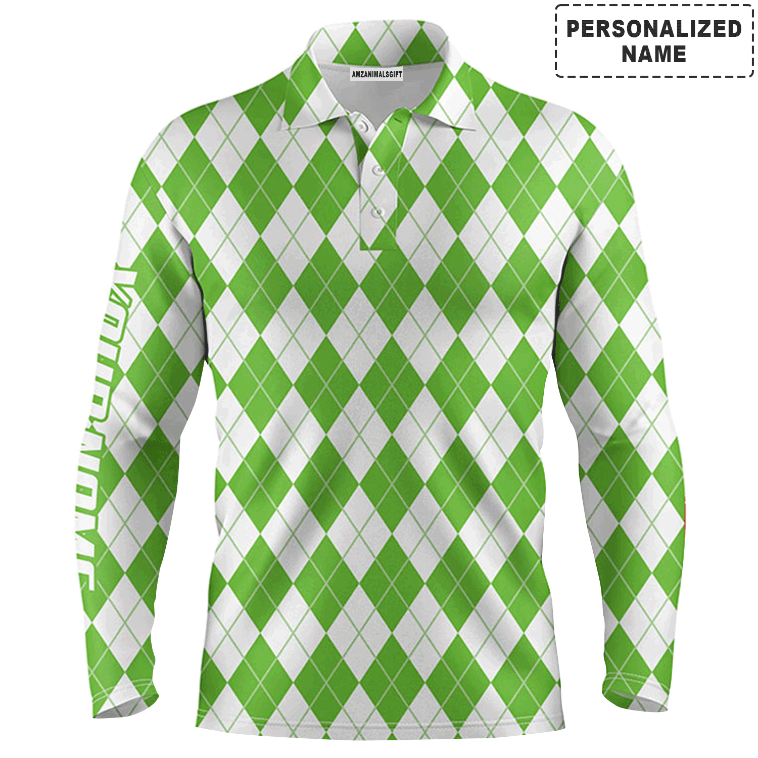 Golf Men Polo Shirt - Christmas Plaid Green And White Argyle Pattern Custom Name Apparel - Personalized Gift For Golf Lover, Men, Husband, Team