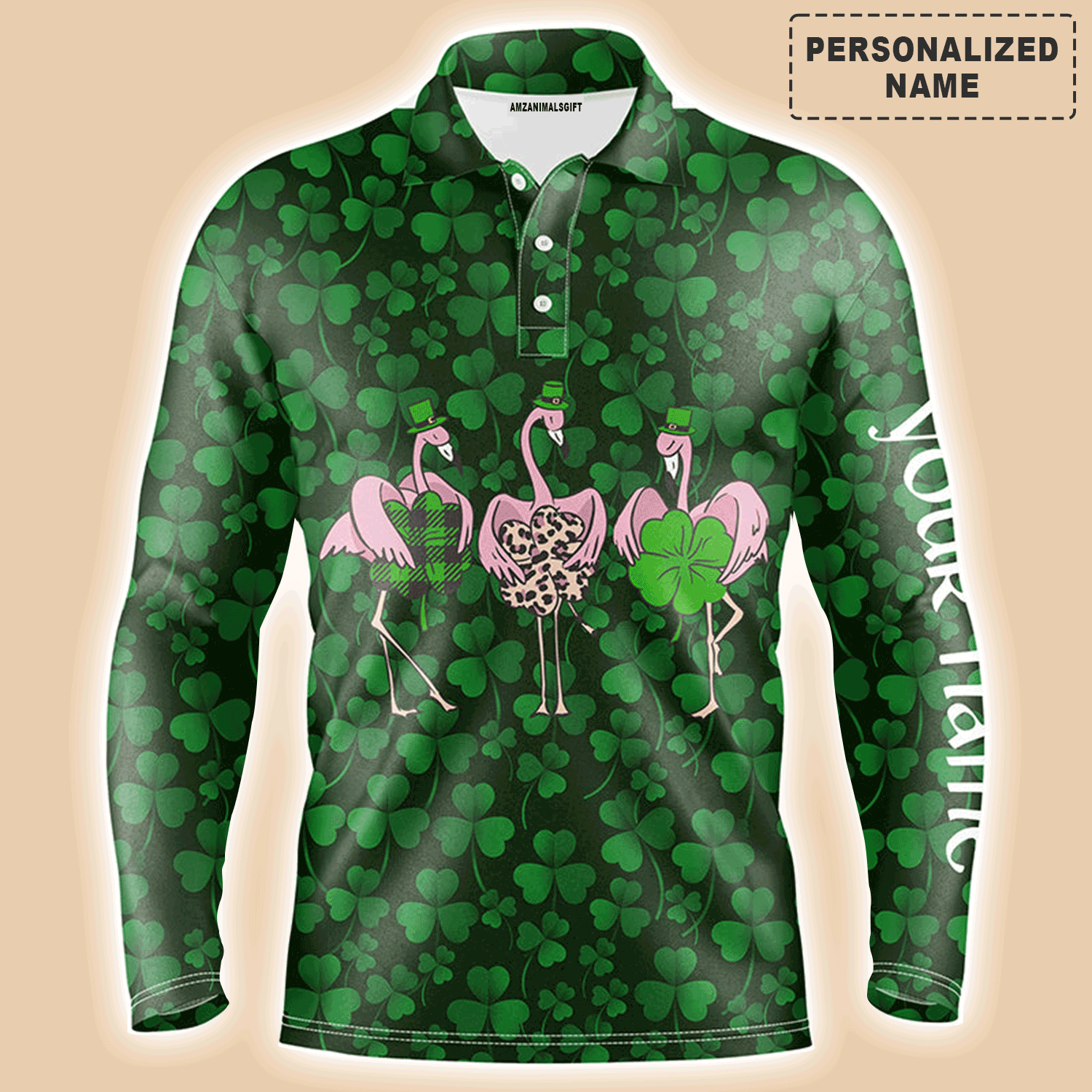 Golf Men Polo Shirt - Funny Custom Name Green Clover St Patrick's Day Background Flamingo Apparel - Personalized Sports Gift For Golf Lover, Male