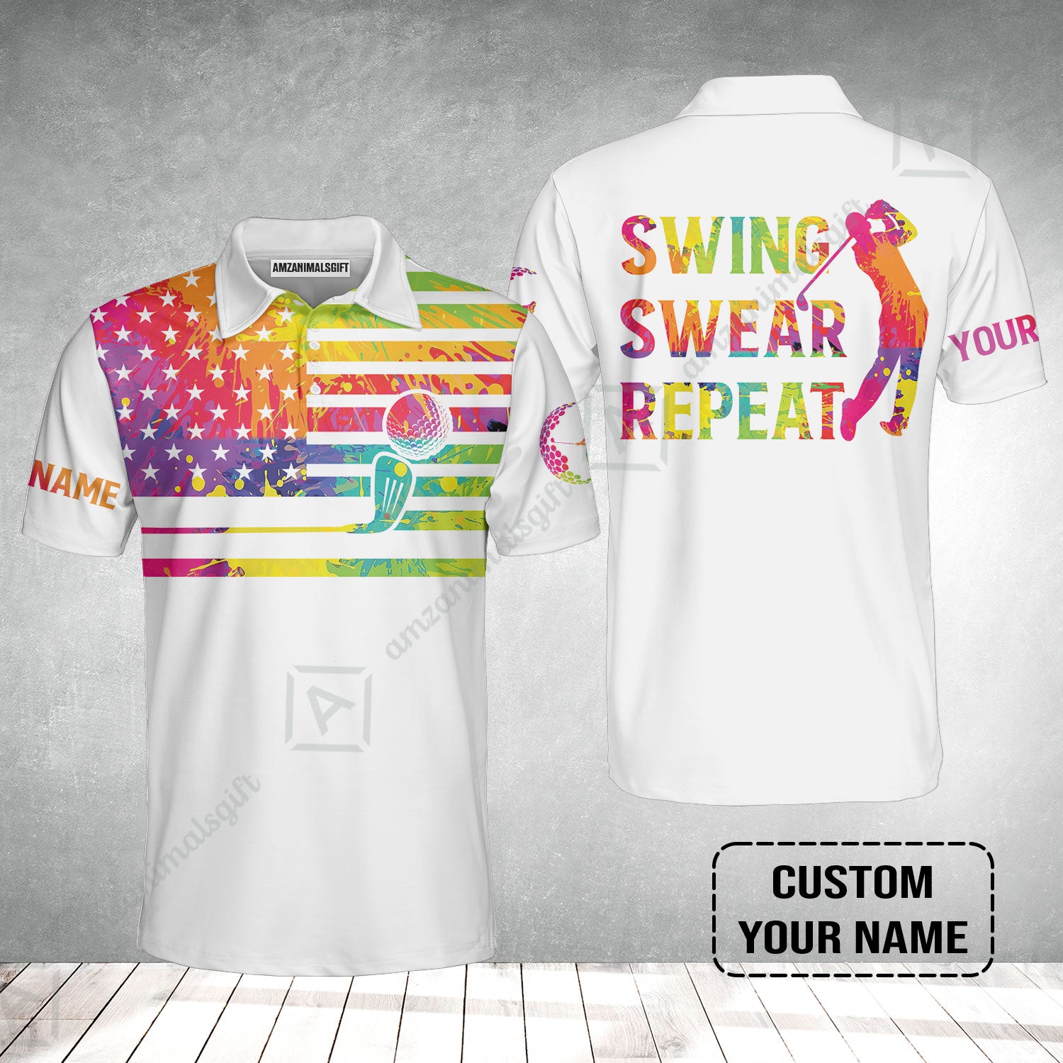 Golf Men Polo Shirt - Funny Watercolor American Flag Custom Name White Apparel - Swing Swear Repeat Golf Polo Shirt