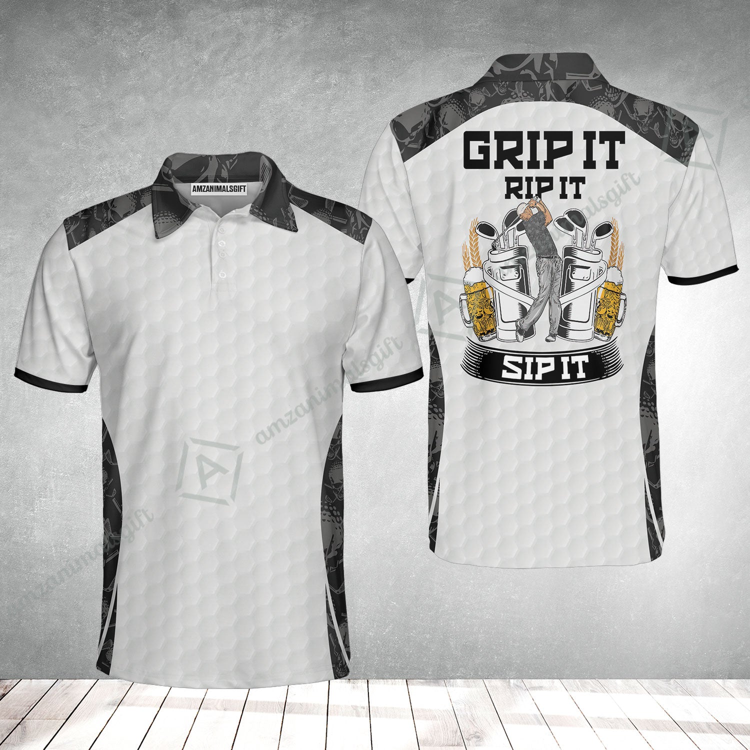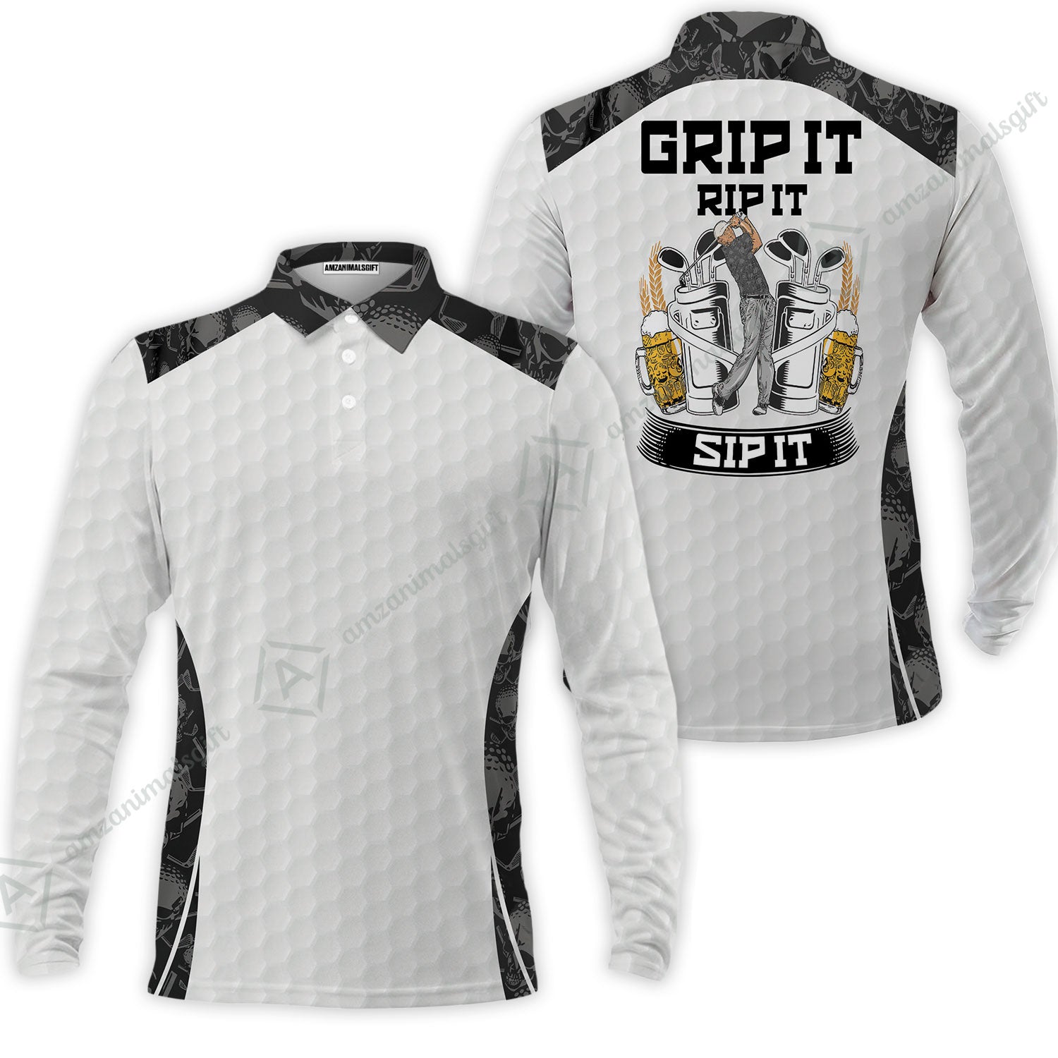 Men Golf Polo Shirt - Golf Ball Pattern Skull, Grip It Rip It Sip It Golf White Men Polo Shirt