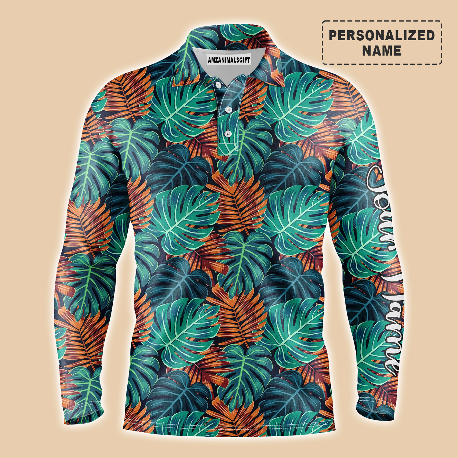 Monstera And Palm Leaves Nature Tropical Pattern Long Sleeve Polo Shirt Custom Name Apparel, Personalized Outfit For Men And Women