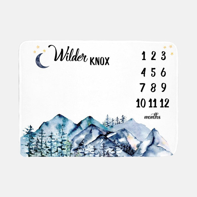 Mountains Moon Baby Milestones Blanket With Customized Name For Baby Boy Nursery, Son, Grandson