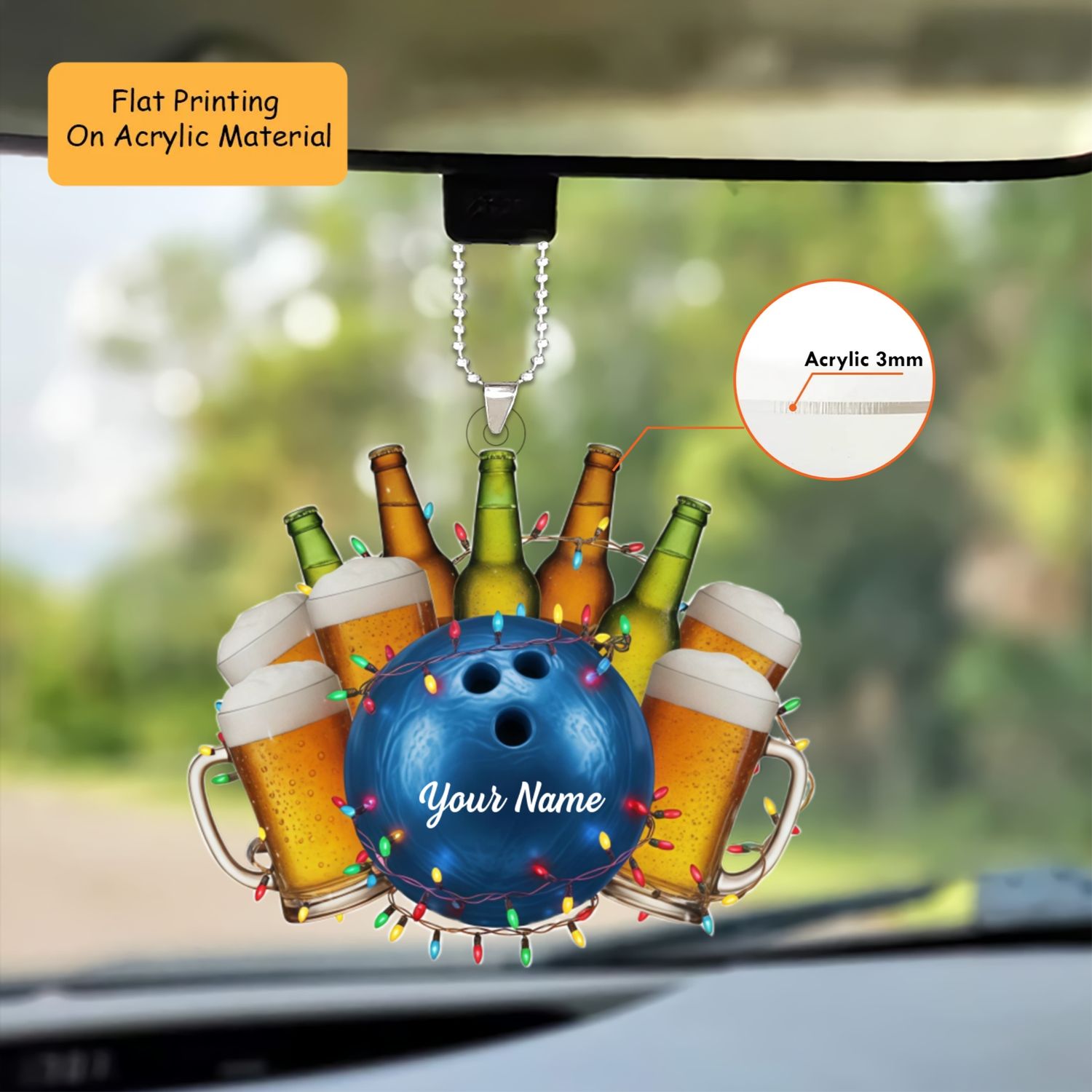 Personalized Bowling and Beer Ornament, Custom Bowling Christmas Gift, Keychain Bowling, Car Ornament Bowling