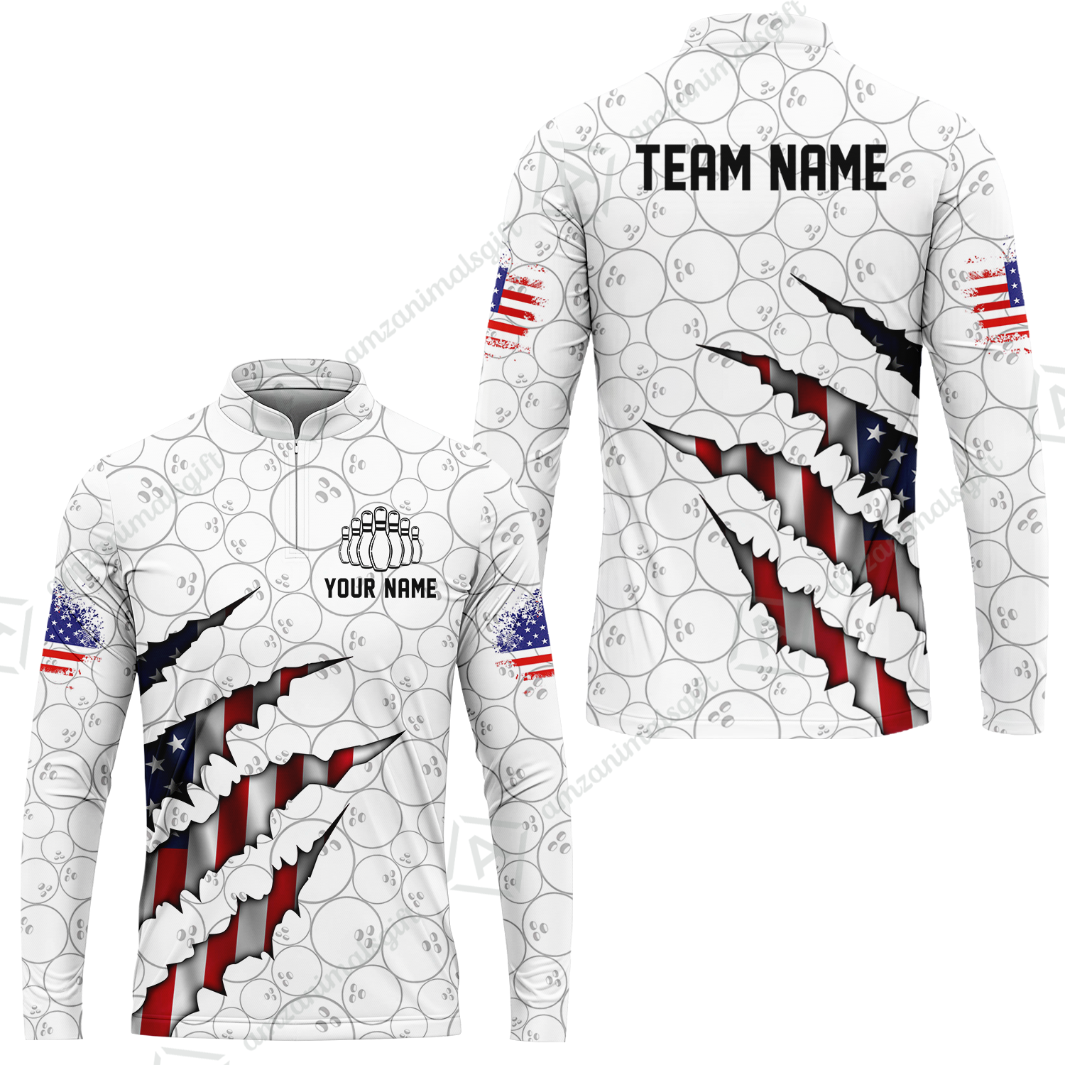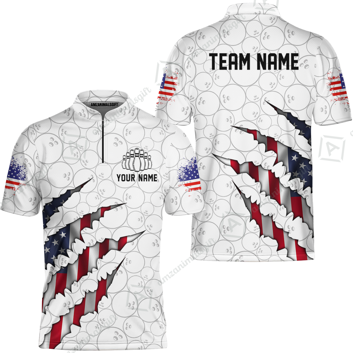 Personalized Bowling Quarter-Zip Jersey Shirt, Bowling American Flag Scratches Shirt For Patriotic Team Men Women Bowlers