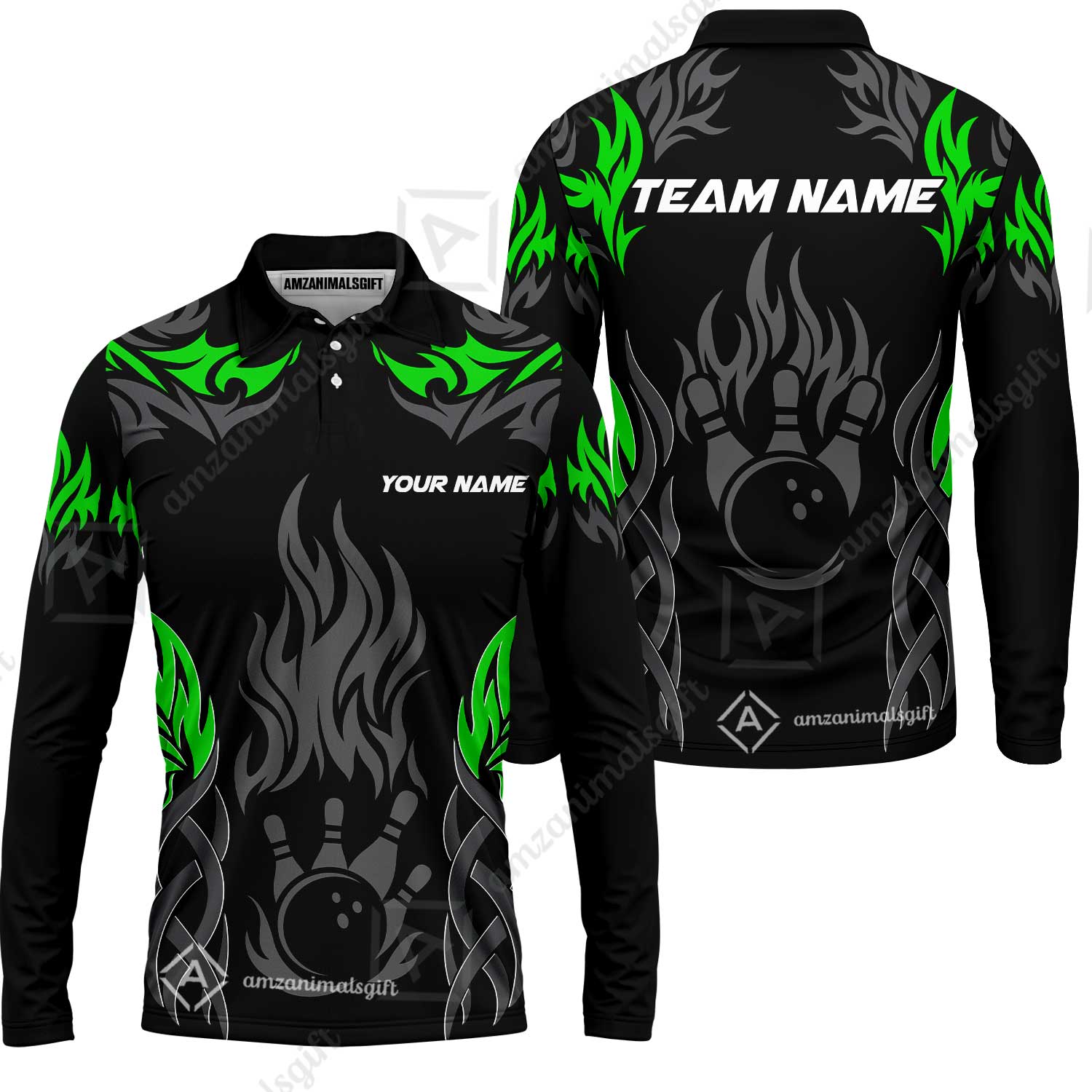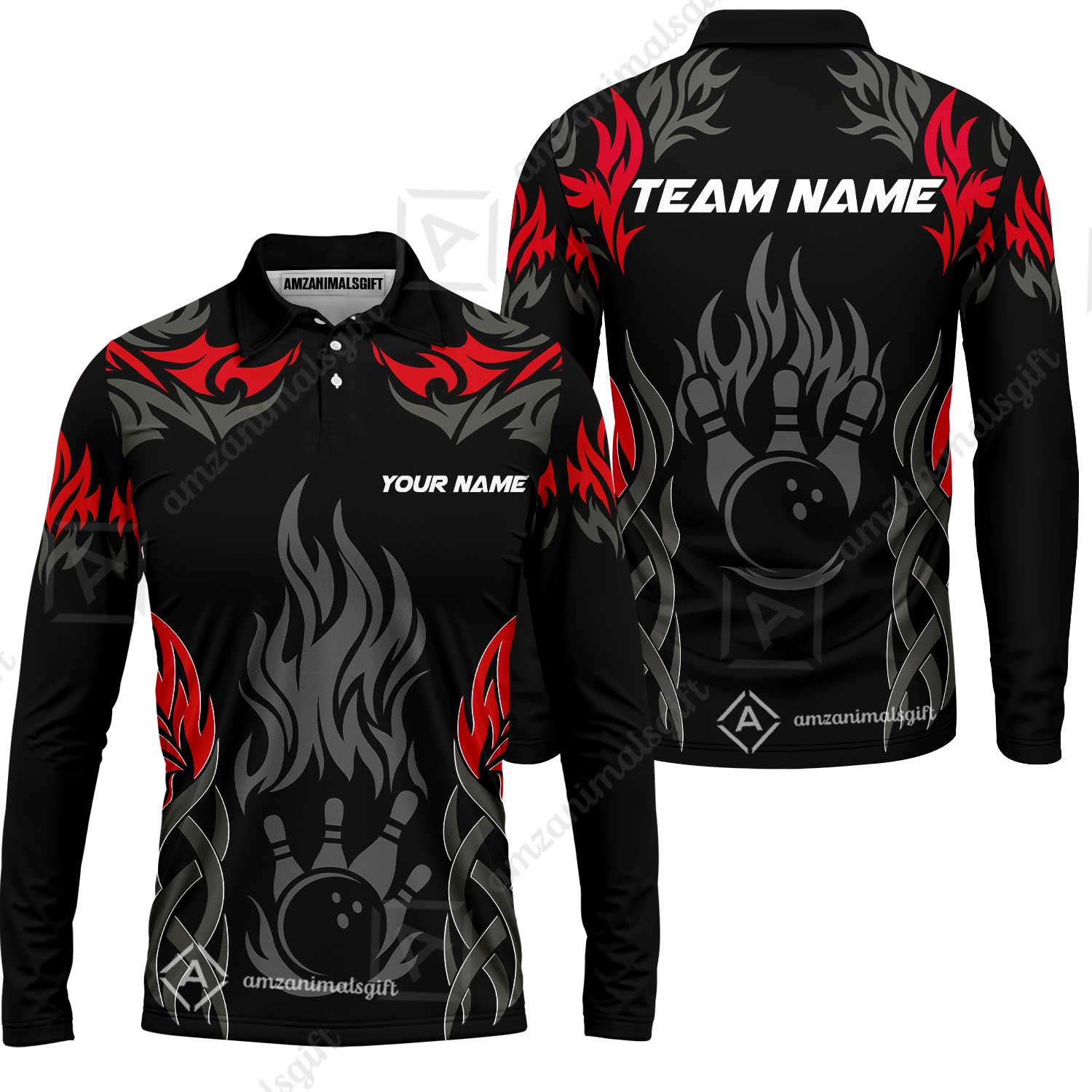 Personalized Bowling Team Long Sleeve Polo Shirt , Tribal And Bowling Flame Multi Option Customized Shirt - Black
