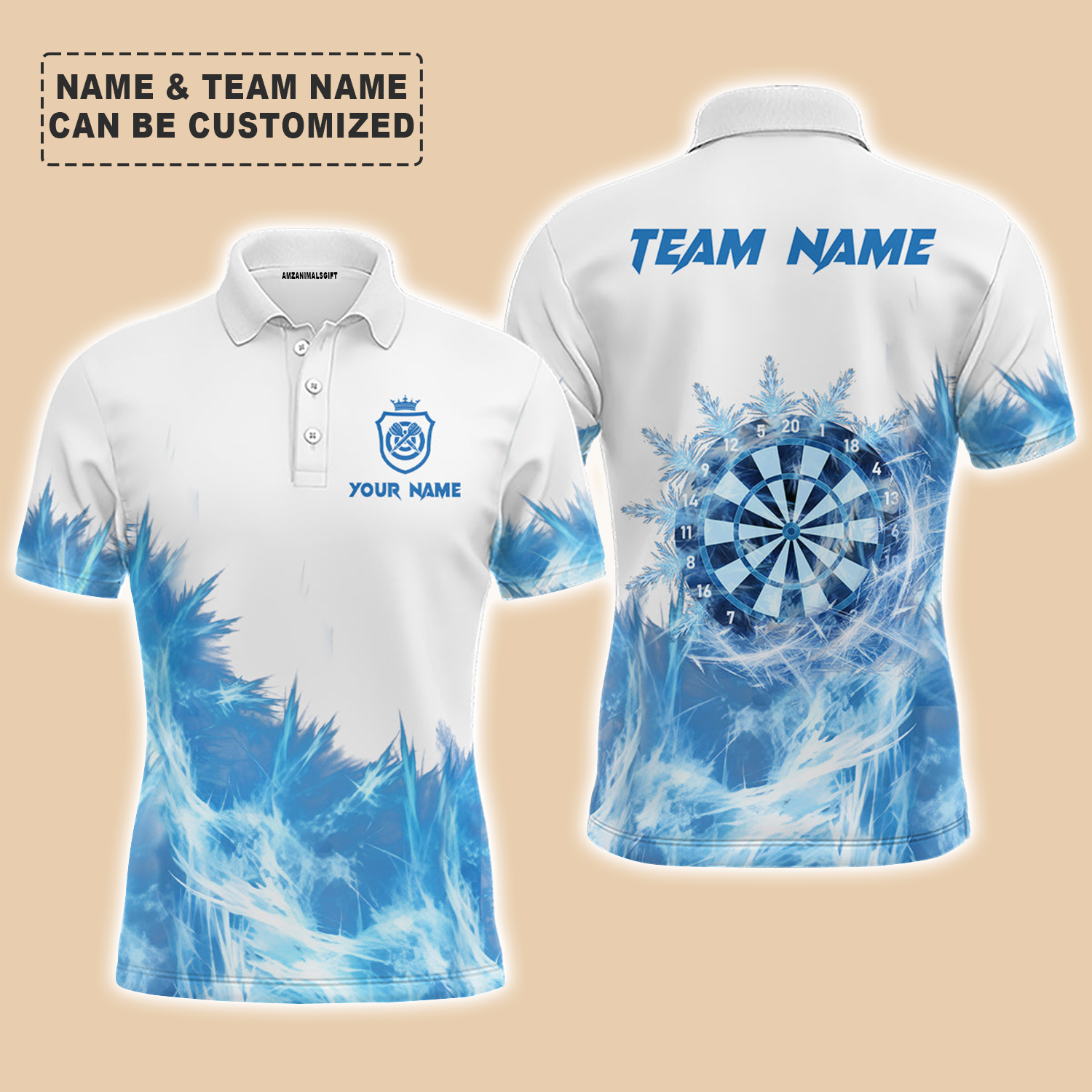 Personalized Darts Men Polo Shirt - Custom Name & Team Name Icy Blue White Mens Darts Polo Shirt For Men, Darts Team, Darts Lover