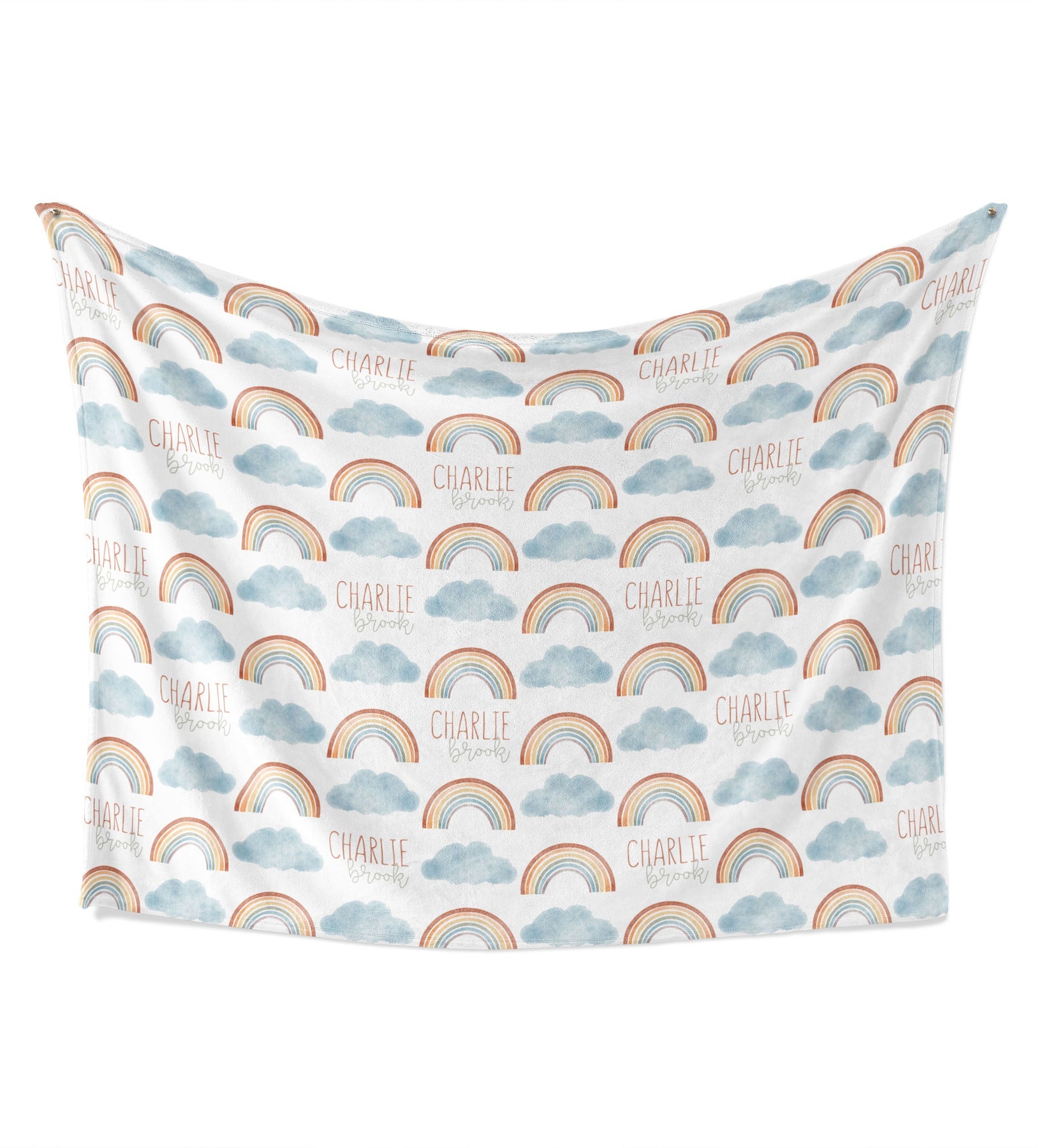 Rainbow Clouds Baby Kids Blanket With Customized Name For Baby Nursery, Son, Daughter, Granddaughter, Grandson